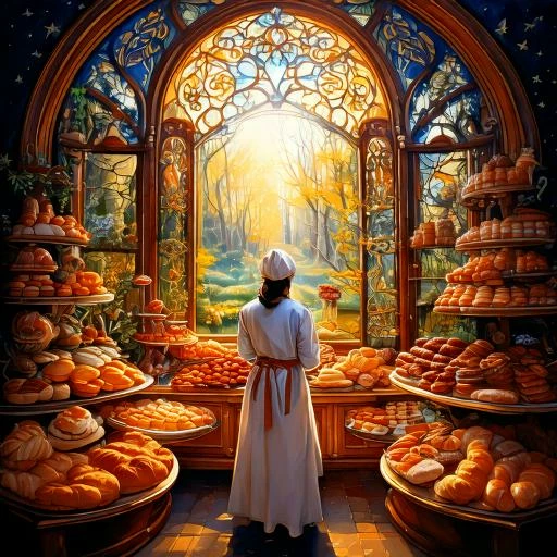 Prompt: A magical fairytale bakery made of bread and cakes in the fairytale forest with a baker standing in front of an art nouveau window with lots of delicious pastries and cakes