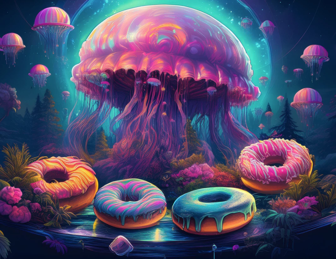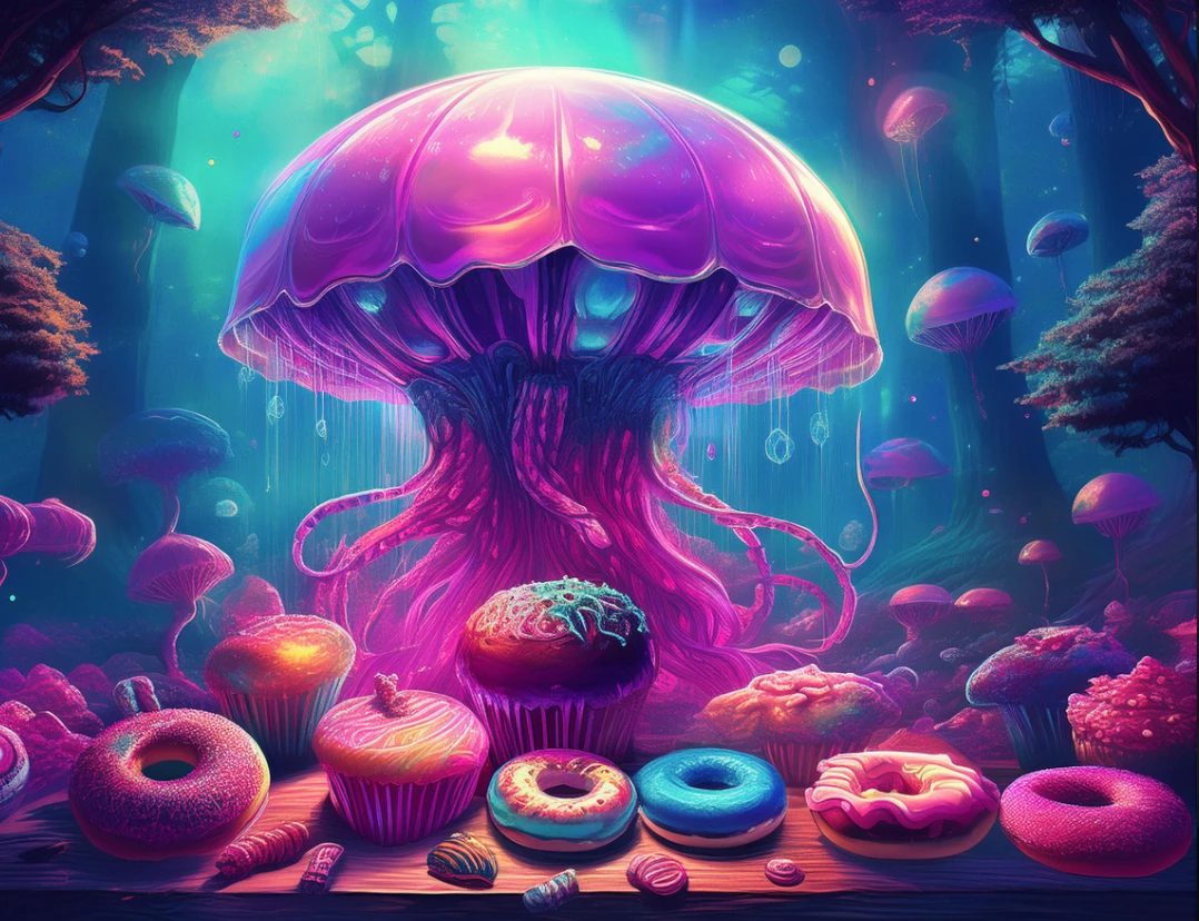 enchanted jellyfish dissolving into a forest, many donuts and pastries