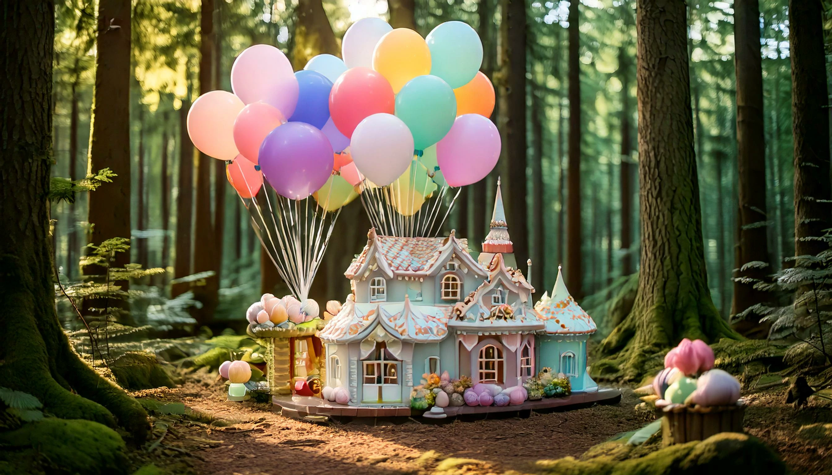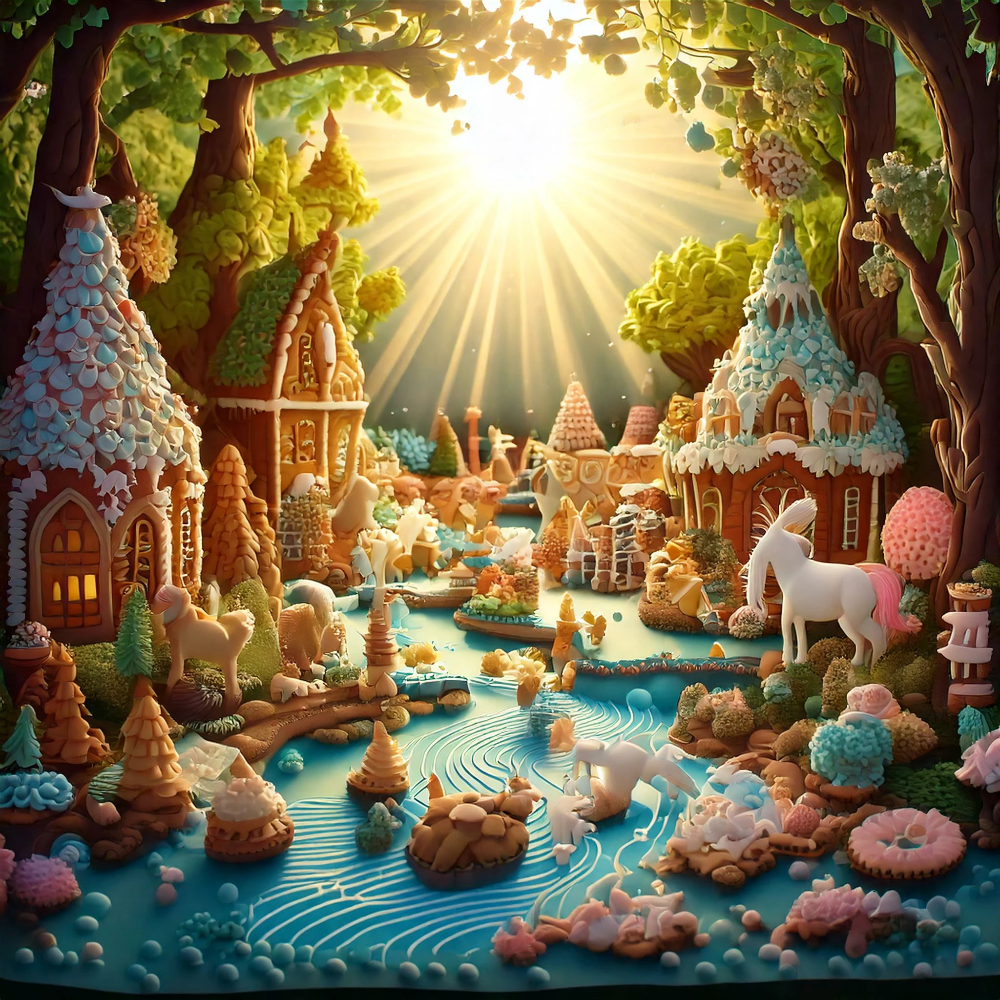 Firefly An enchanting bakery made of cookies in a forest made of frosted cake with animals drinking from chocolate rivers