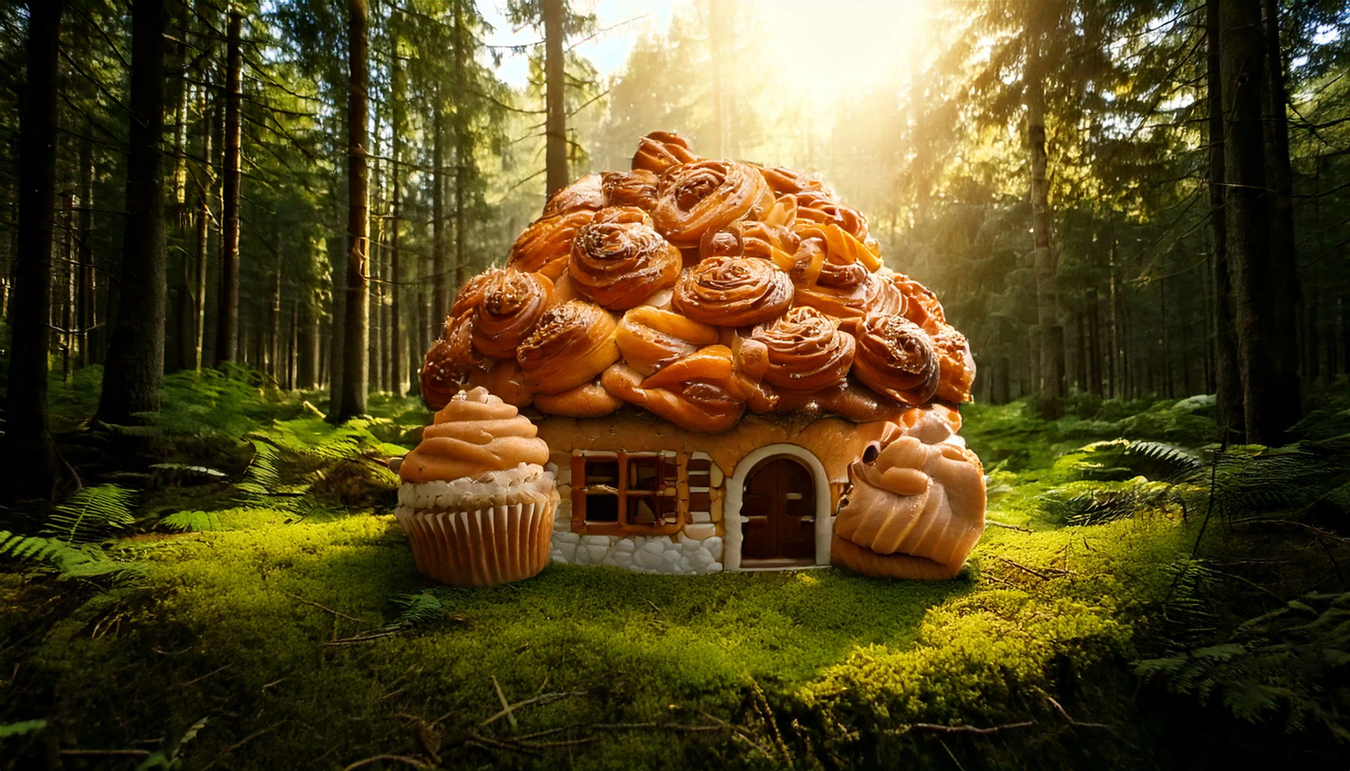 A photo of a house in a forest and made entirely of cupcakes and cinnamon buns.