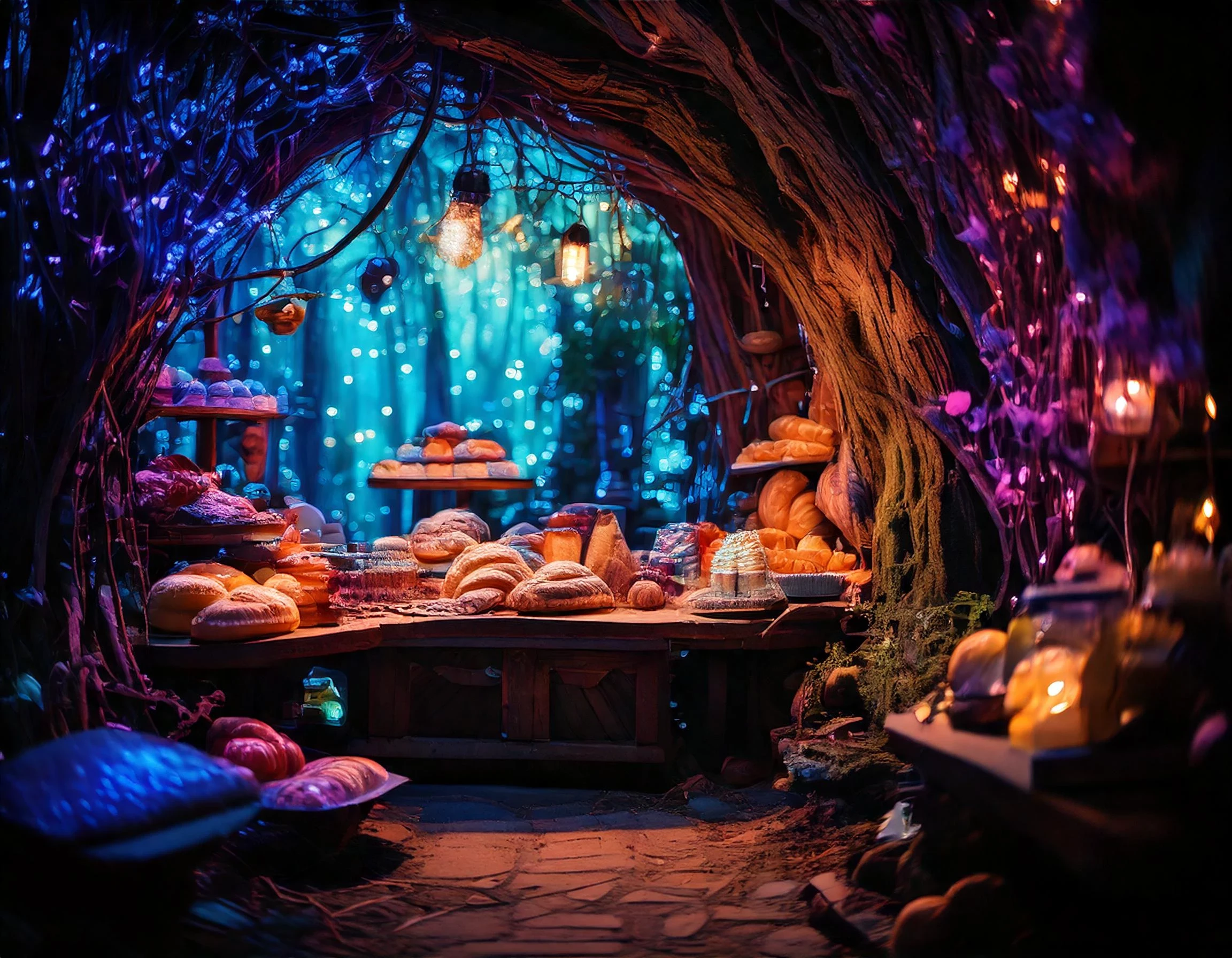 A look inside a bakery in the middle of an enchanted forest, located in a hollow old tree; the bakery has beautiful cakes and delicious fresh baked breads on display