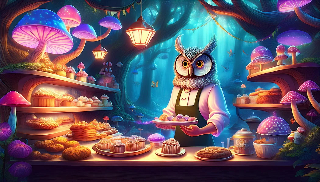 prompt: Beneath towering, bioluminescent mushrooms, the Enchanted Forest Bakery glows with warmth, its sugar-spun vines curling around the walls like whispers of old magic. Floating trays carry shimmering pastries through the air. An owl clerk perches behind the counter.