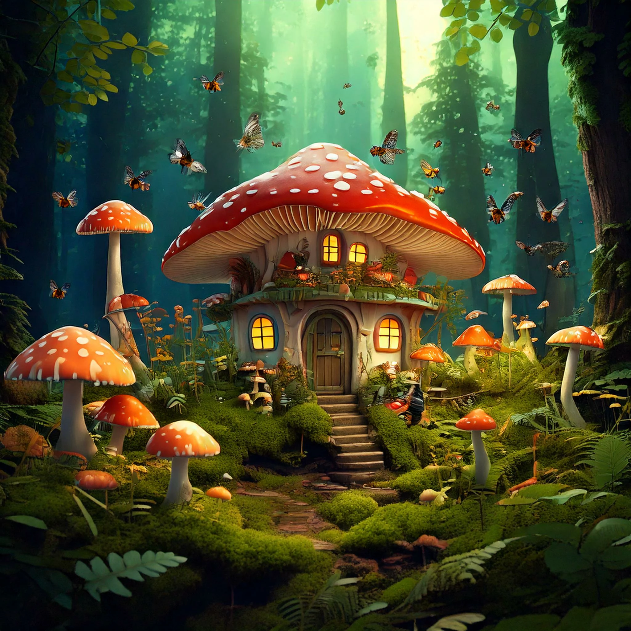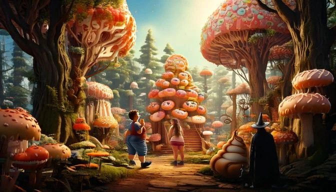 The Prompt I used: An enchanting bakery hidden in a magical forest, with trees and frosting-covered mushrooms. The bakery is surrounded by glowing cupcakes and sugar-dusted flowers, with streams of honey flowing through the scene