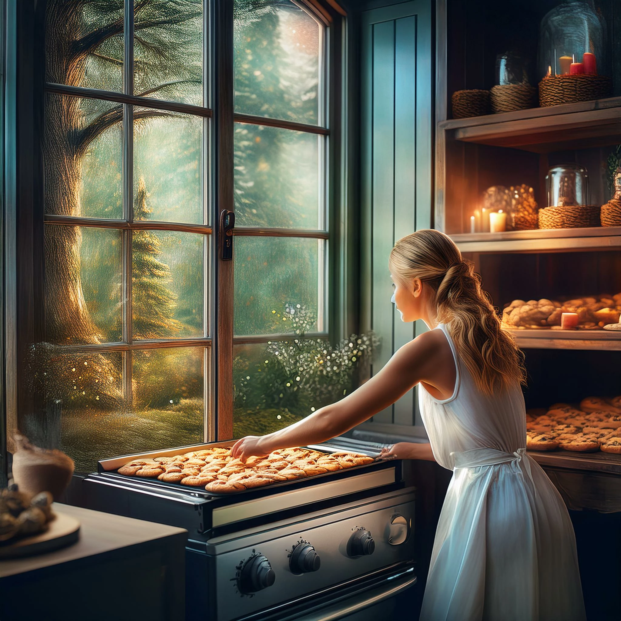 Prompt: bakery with baker putting cookies in the oven and looking out window at enchanted forest