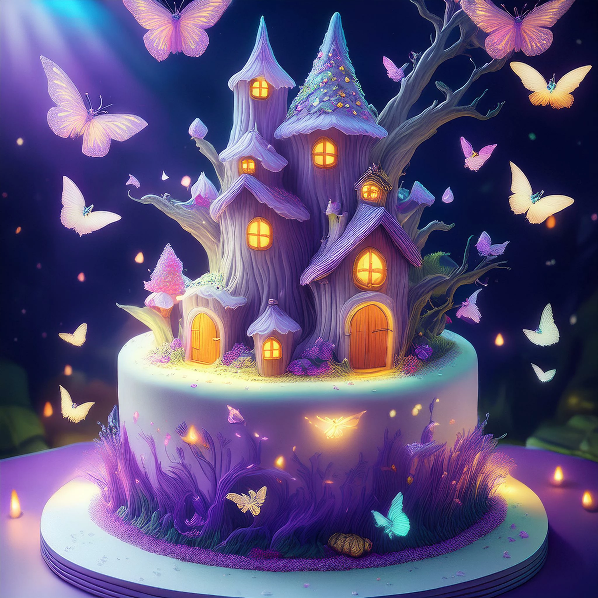 In an enchanted forest with fireflies, is a giant 3-layer cake with white icing. Purple sugared pansies and multiple sugared birdhouses decorate the cake. Lively gummy birds flying.