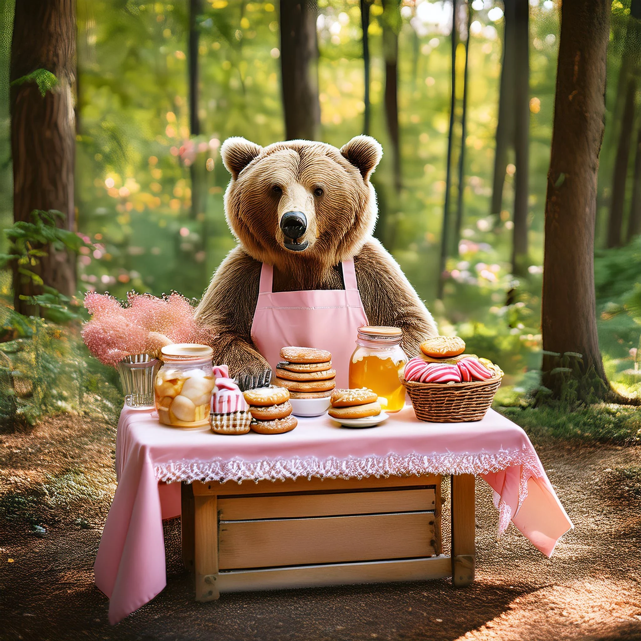 "cozy bakery themed stand in a summer forest featuring a bear, wearing a retro pink apron with ruffles and frills, serving sweet treats, cinnamon buns, donuts, and artisanal honey Magical feel"