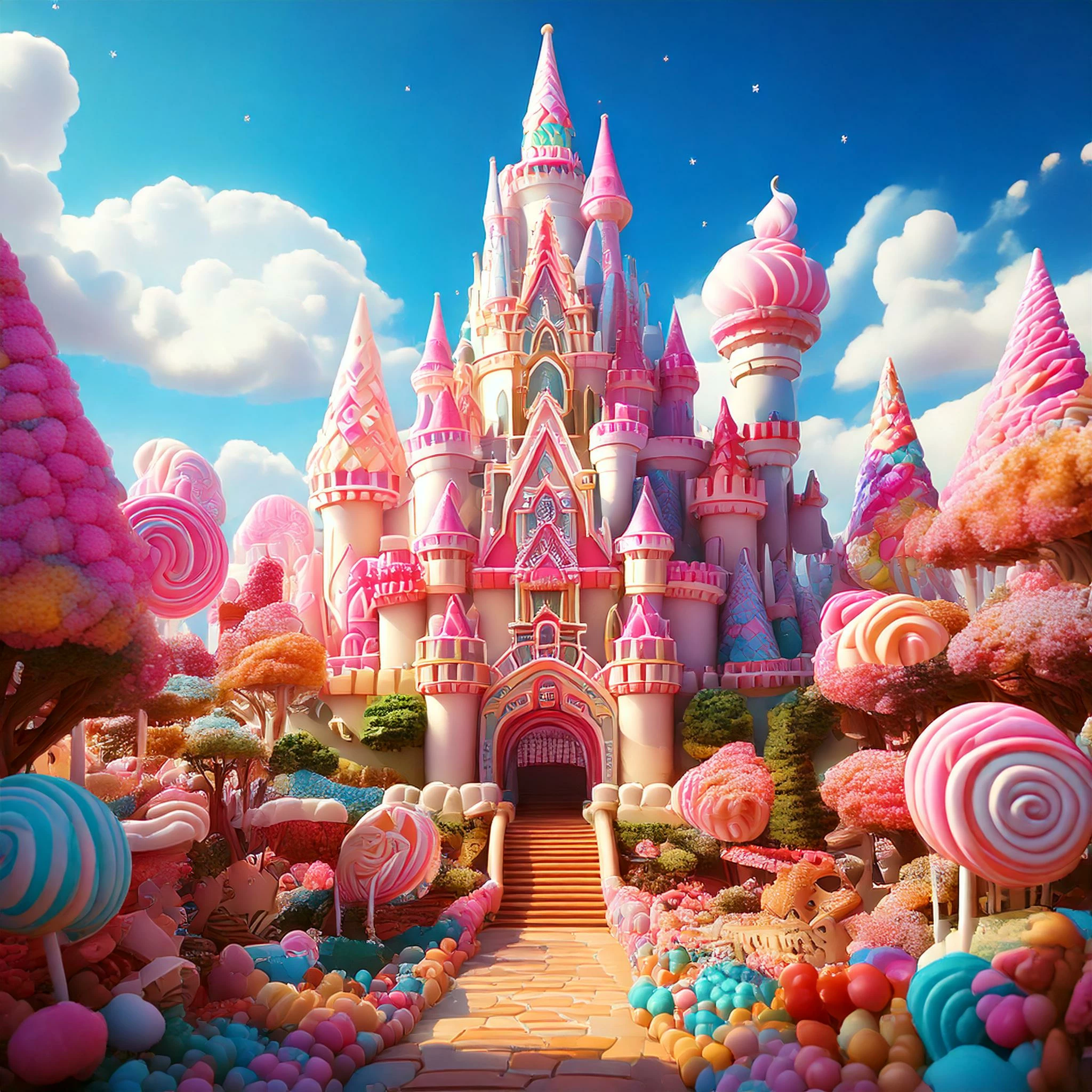 A whimsical fairy tale castle made entirely of cake, candy, and frosting, standing in the middle of an enchanting forest of candy trees. The castle features tall ice cream cone towers and jellybean pathways.The candy trees have cotton candy leaves, licorice trunks, and lollipop flowers. In the background, majestic mountains peaks rise under a dreamy pastel sky.