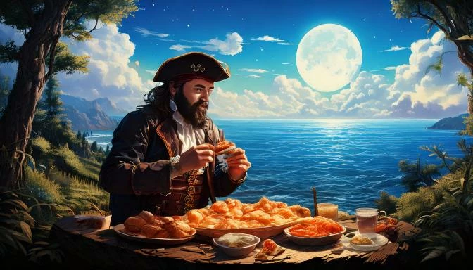 Prompt: pirate eating bakery breakfast pastries in an enchanted forest overlooking the ocean with white clouds and moon