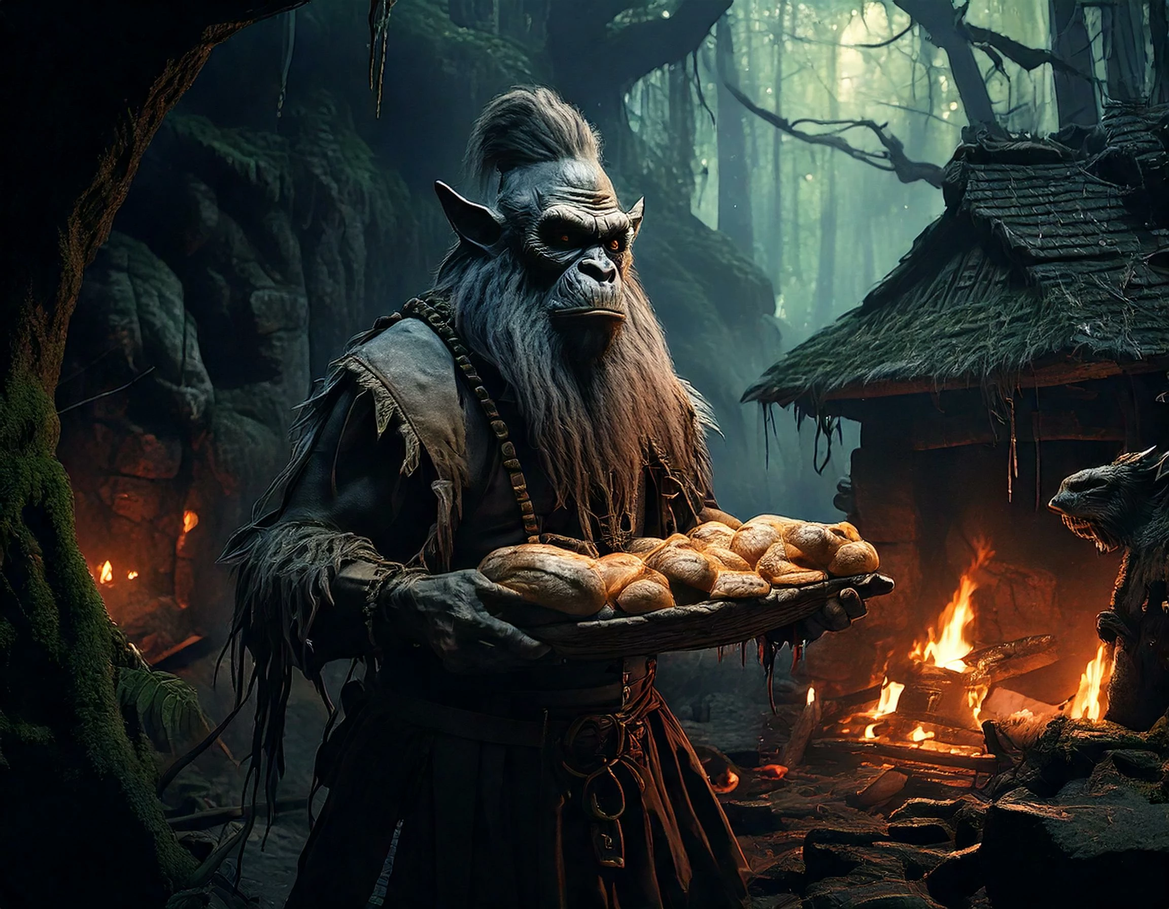 Prompt: A dark sinister forest scene, a rock dwelling with smoke coming out of the chimney, troll like baker handing load of bread to wargs