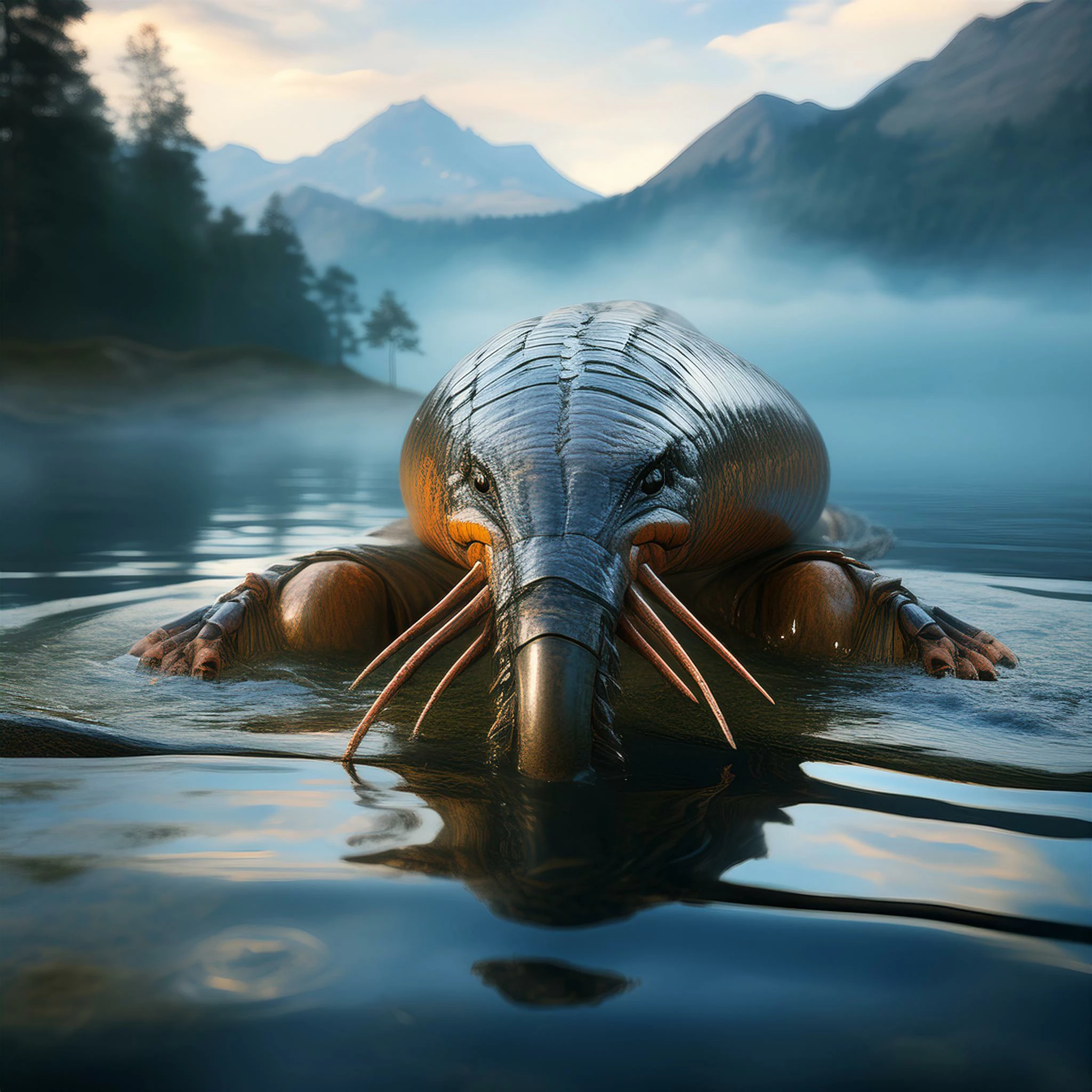 An animal that is half lobster half platypus in fantasy style in an eerie lake with mountains in the background. Shallow depth of field. fog