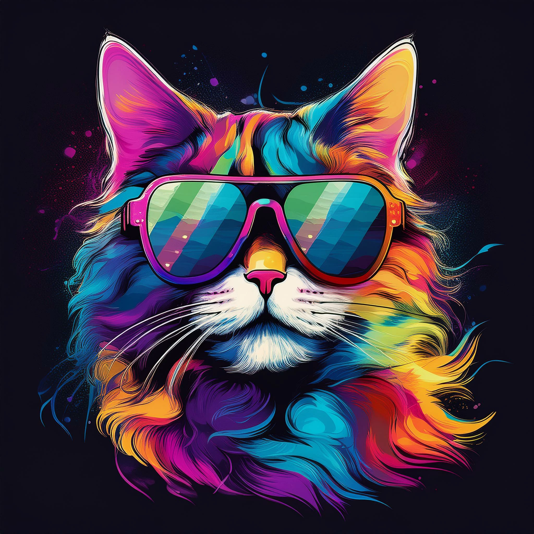 a multicolored flying cat with sunglasses