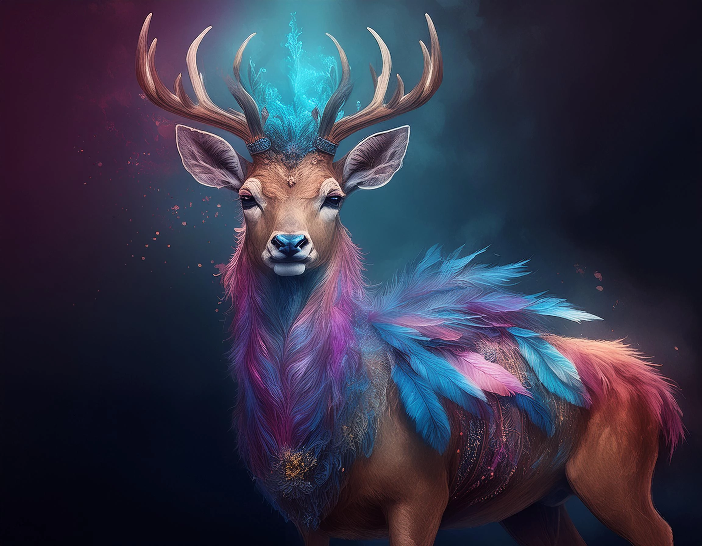 Whole body of a cute deer with a colorful feather coat, mystical fantasy creature, glamorous look; unique artistic photo