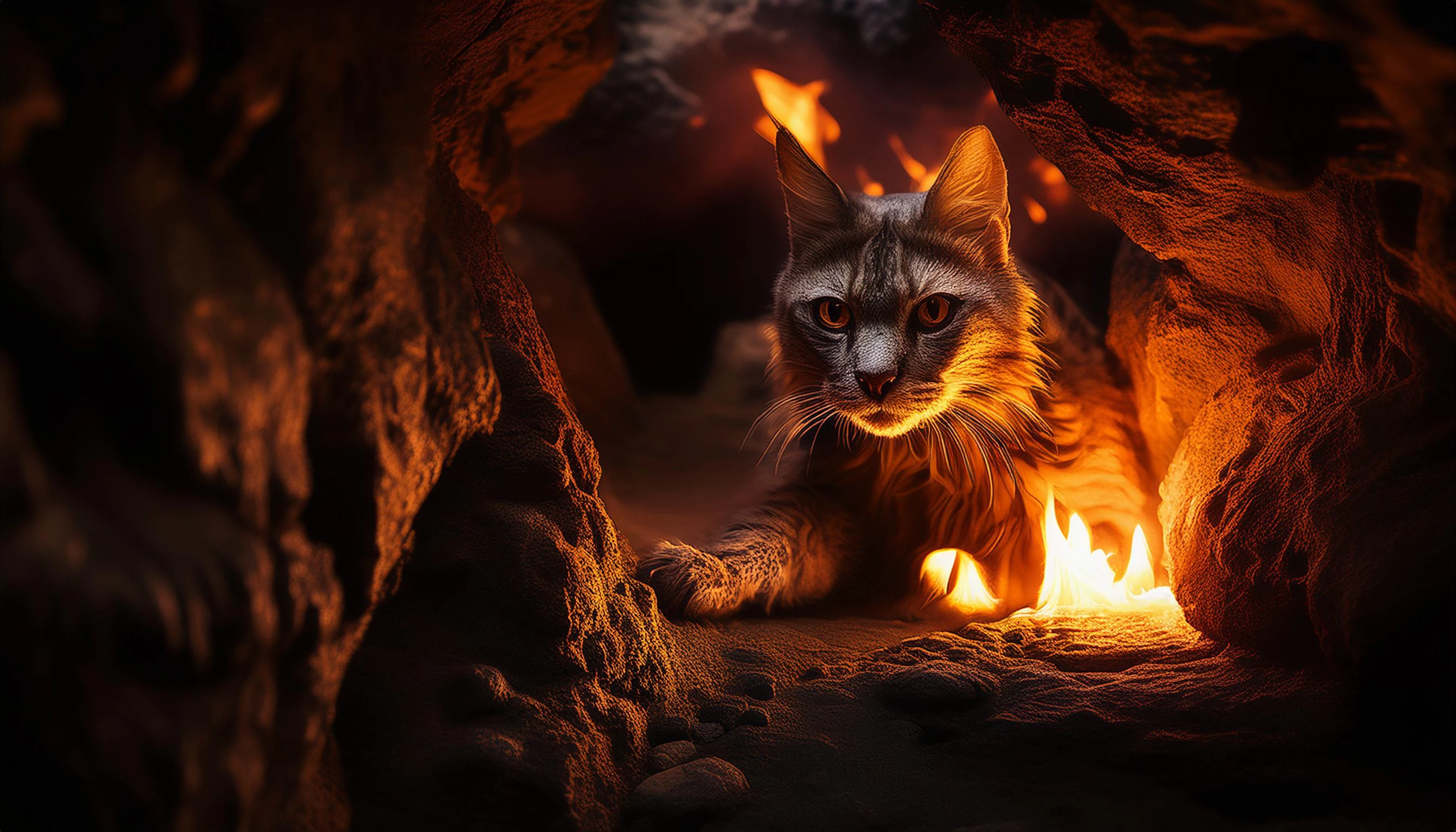 cinematic photograph of a dragon cat lurking within a dark cave, seething flames