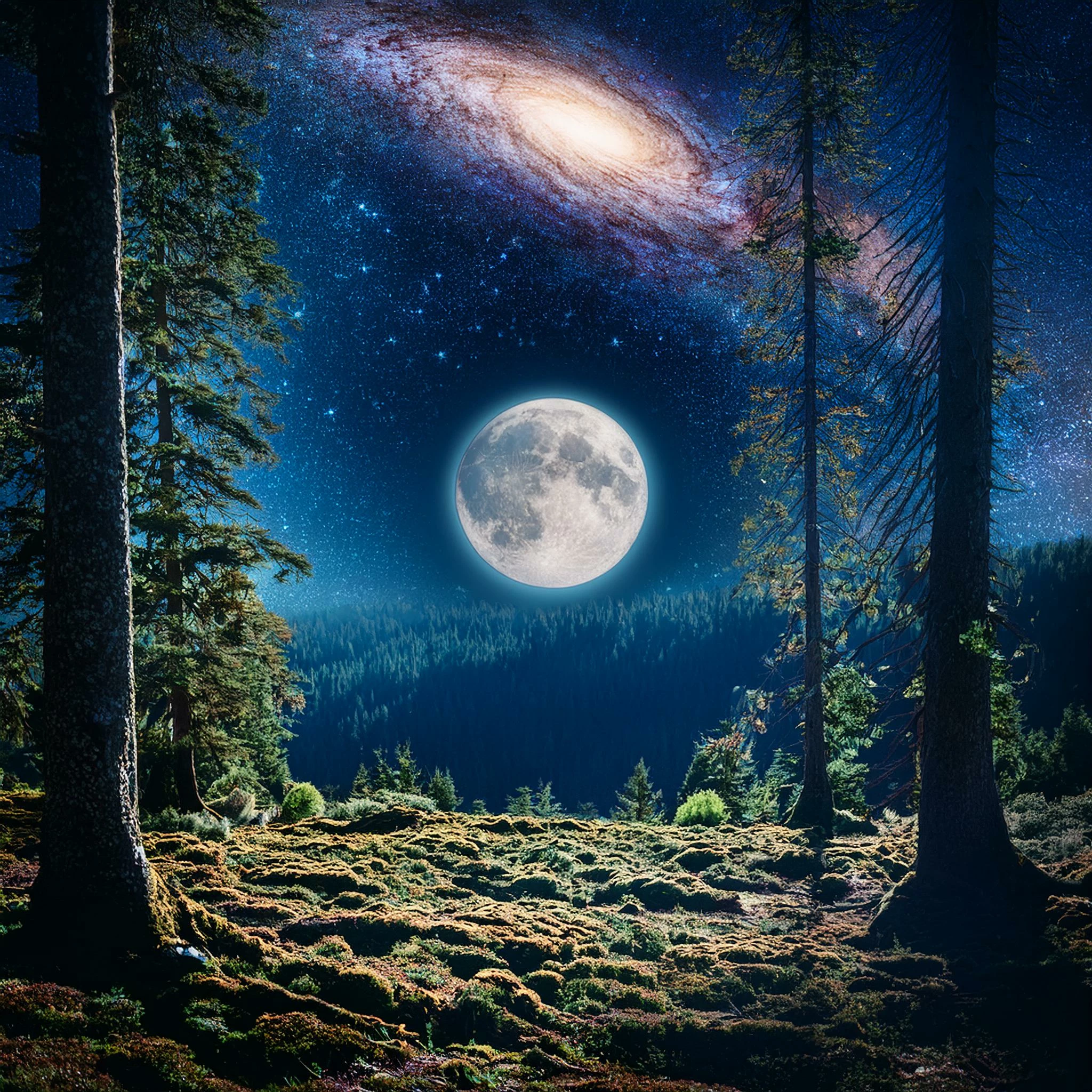 My Prompt: A dense, ancient forest bathed in the soft light of two moons—one a nearby planet, the other a distant celestial body. Above, a fantastic galaxy full of stars twinkles, with a dark, ominous black hole subtly distorting space and time, adding an eerie, magical atmosphere to the scene.
