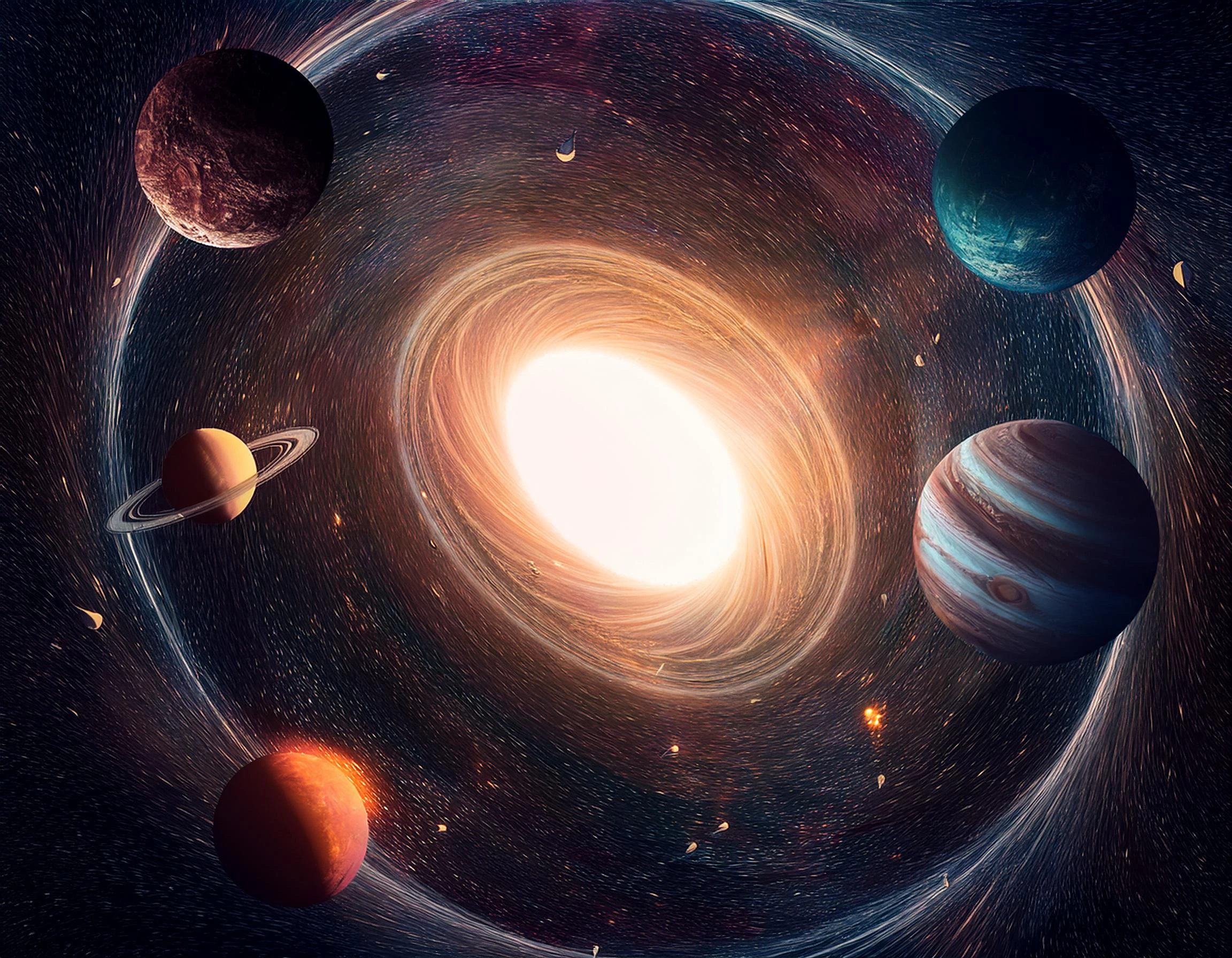 Prompt: create an fantasy universe of planets orbiting a giant sun, add wormholes and a black hole, lots of stars in the background in muted colors