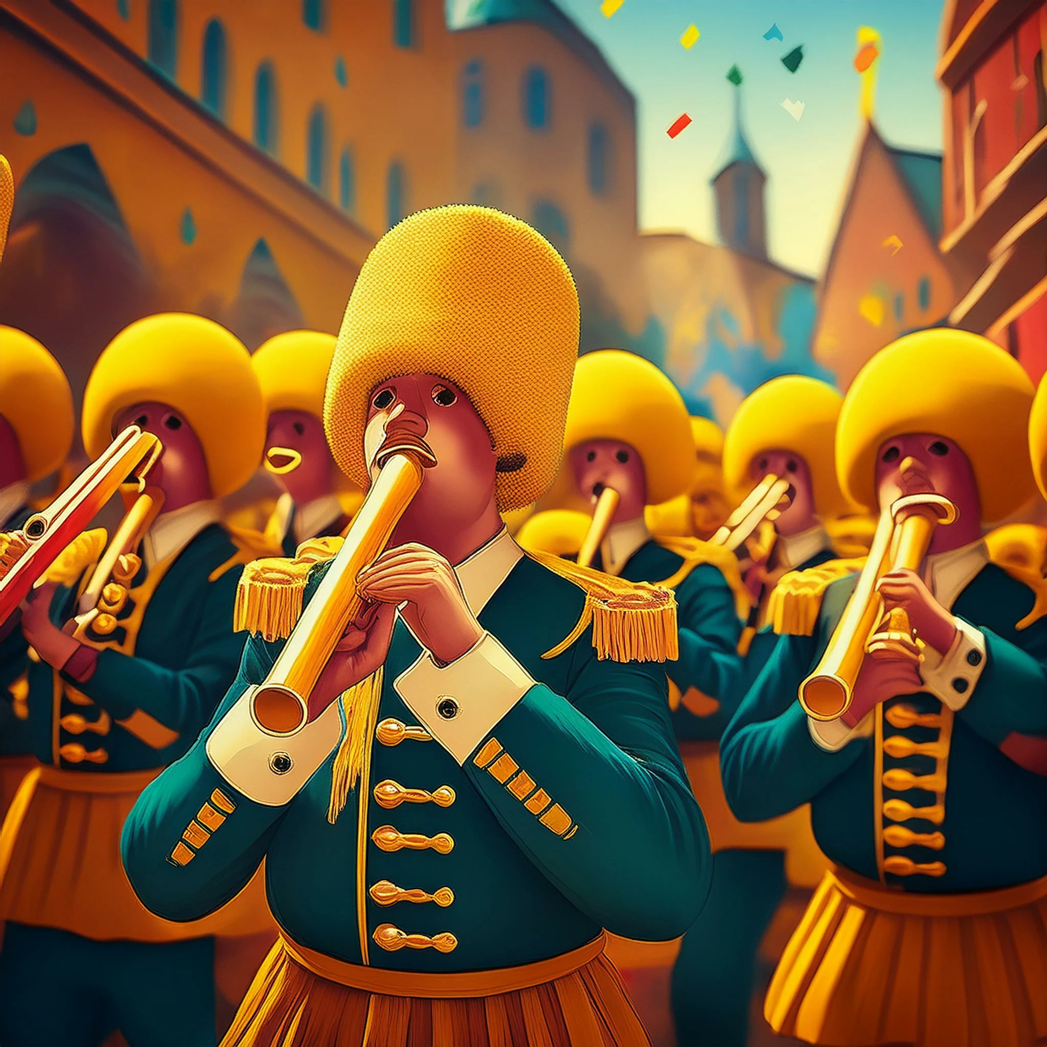 I went for a marching band of Sponge Bob Squarepants-like characters playing their kazoos. What can I say, I'm channeling my kid here ...