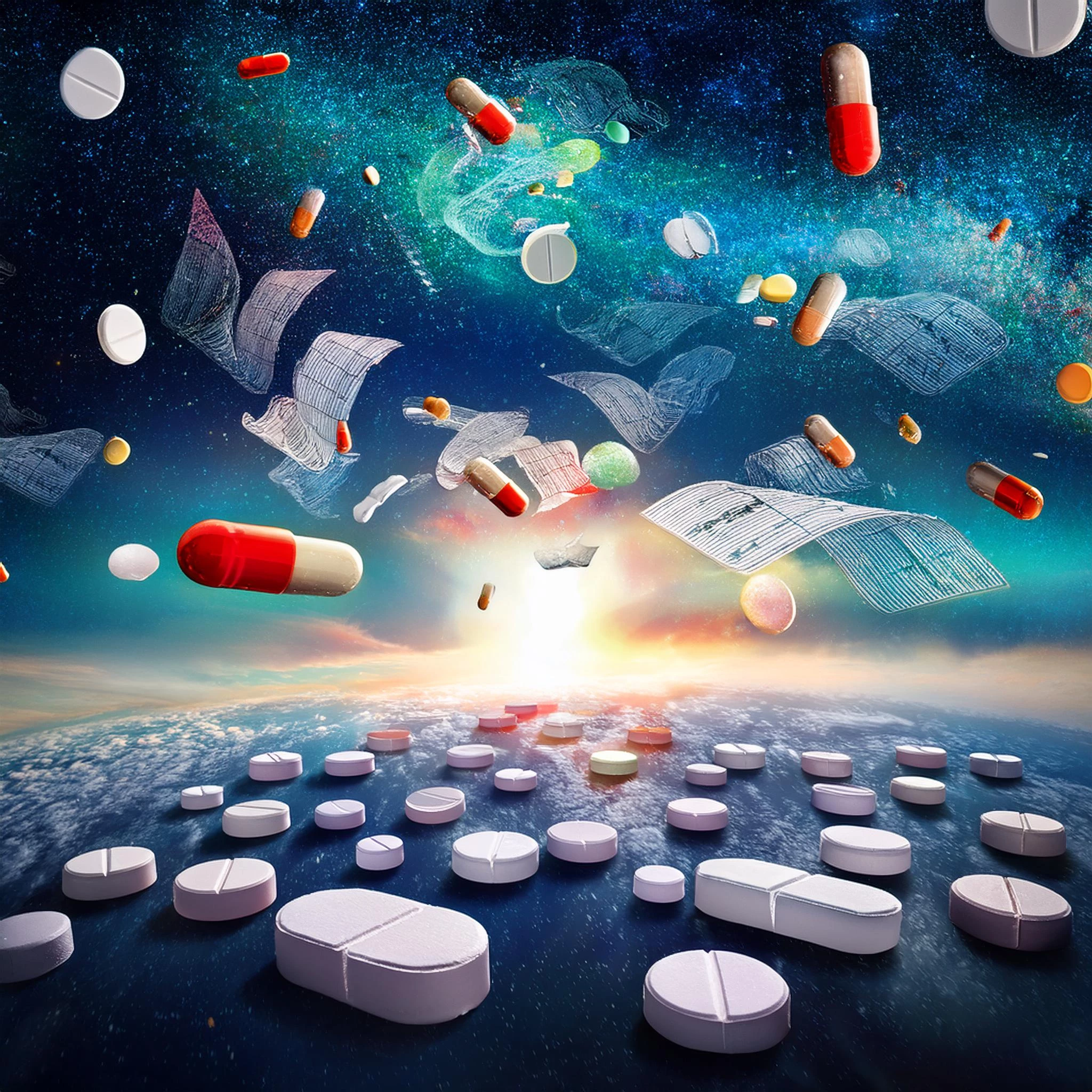 A universe made of big pills and medicines, on the sky, far away, there are some papers that look like medical perspcription