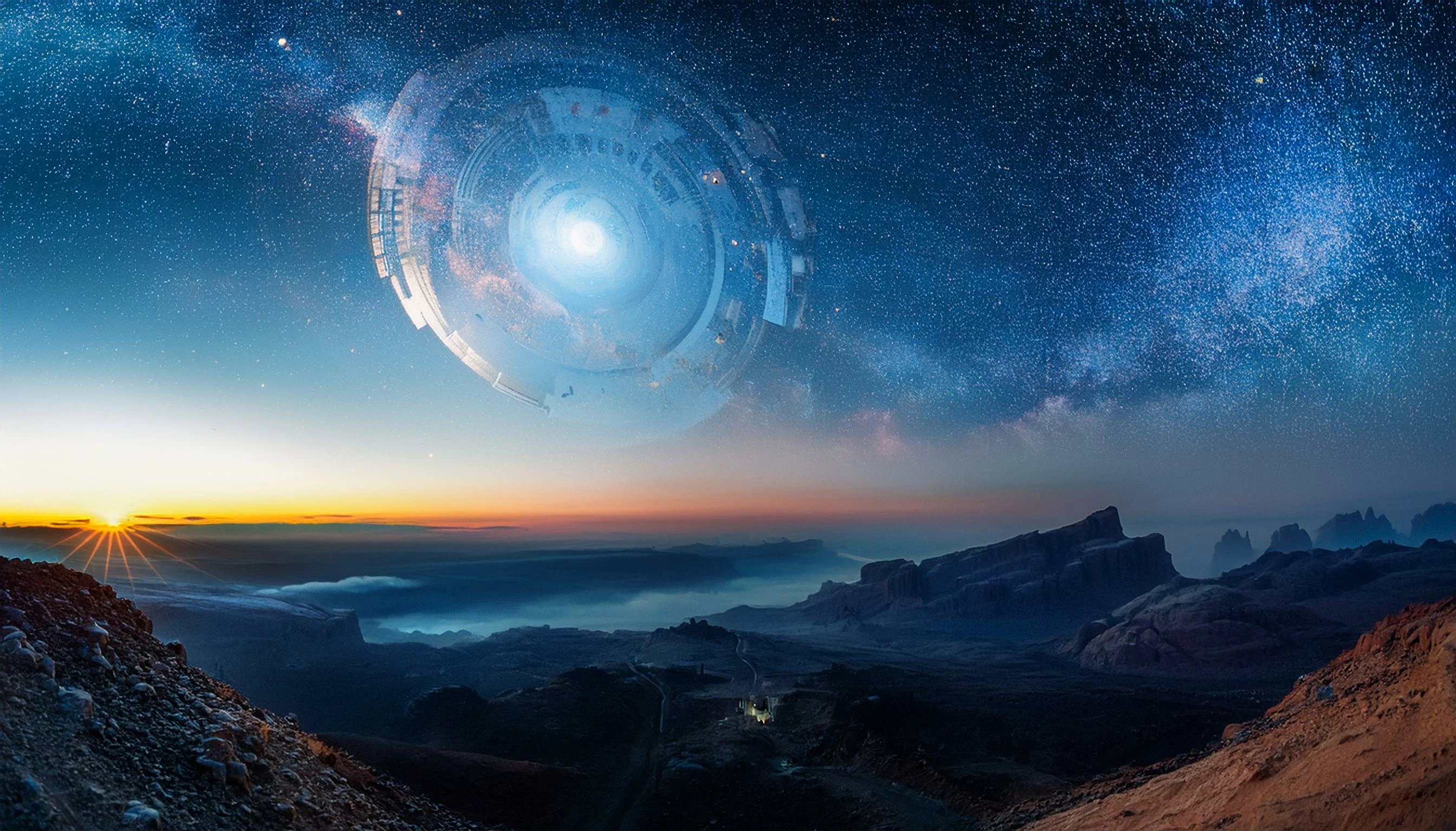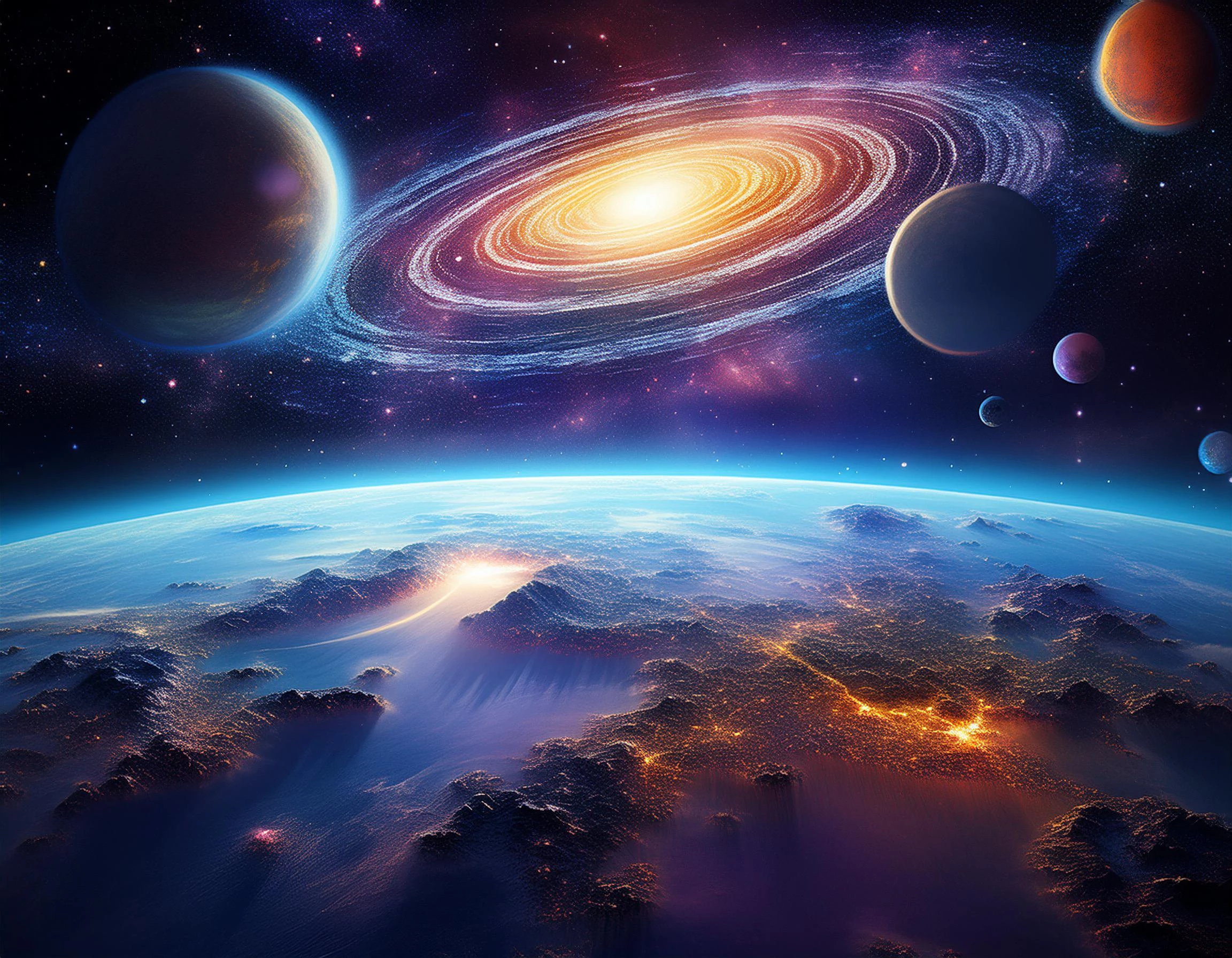 The Prompt I used: create a multiverse inclusion of two planets in the sky; fantastic galaxy with many stars add black hole.