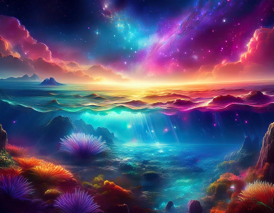 fantasy underwater galaxy of colour and light with magical sky