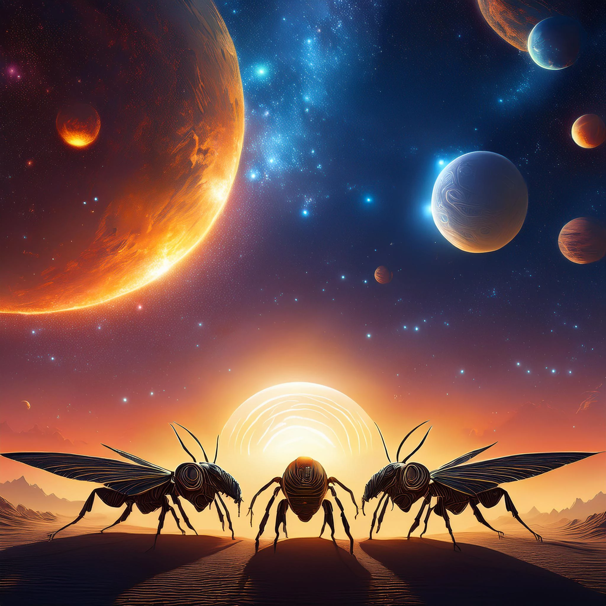 Prompt : giant insects armada under a galaxy with 3 suns