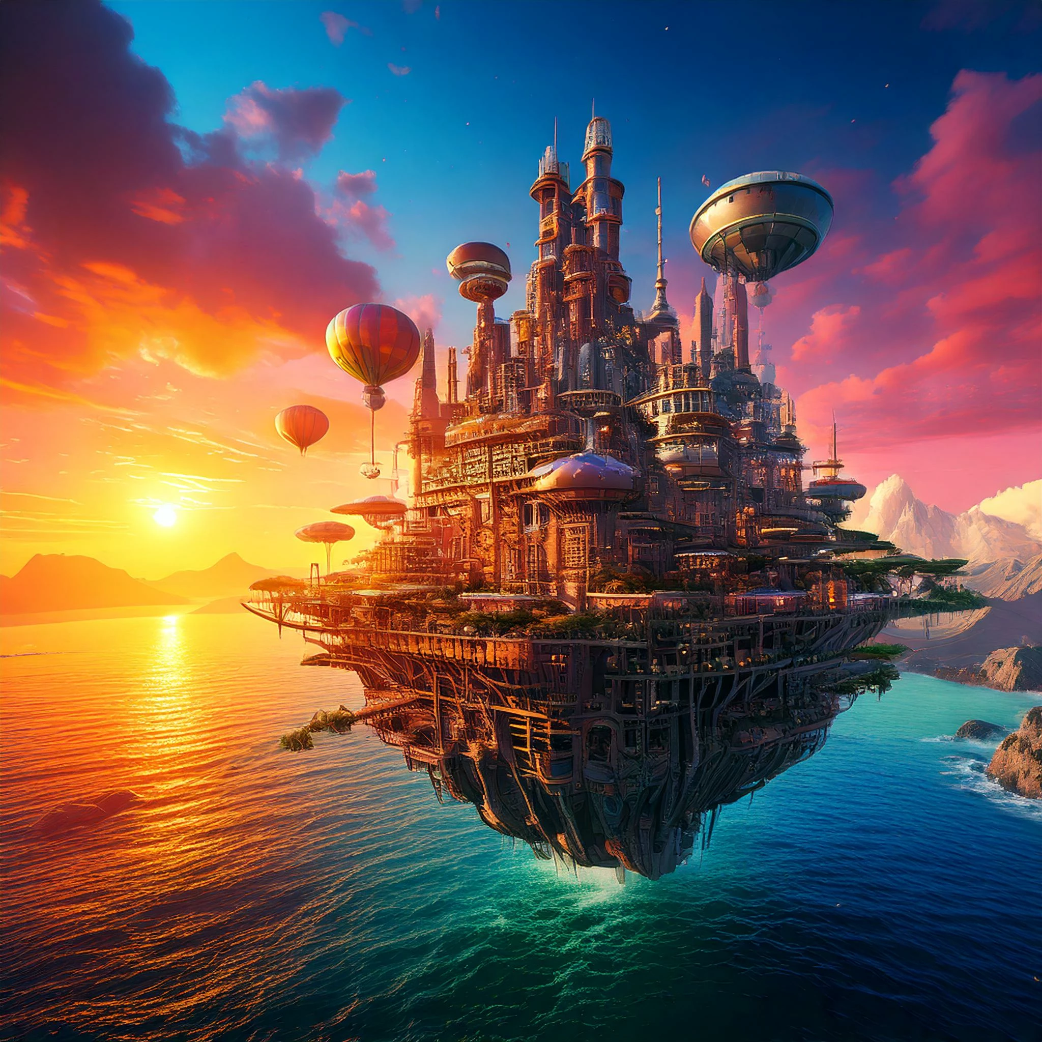 The Prompt I used: Levitating islands drift gracefully in the air, while cascading waterfalls tumble down, adding to the dreamlike atmosphere evokes a sense of magic and serenity in this otherworldly landscape.