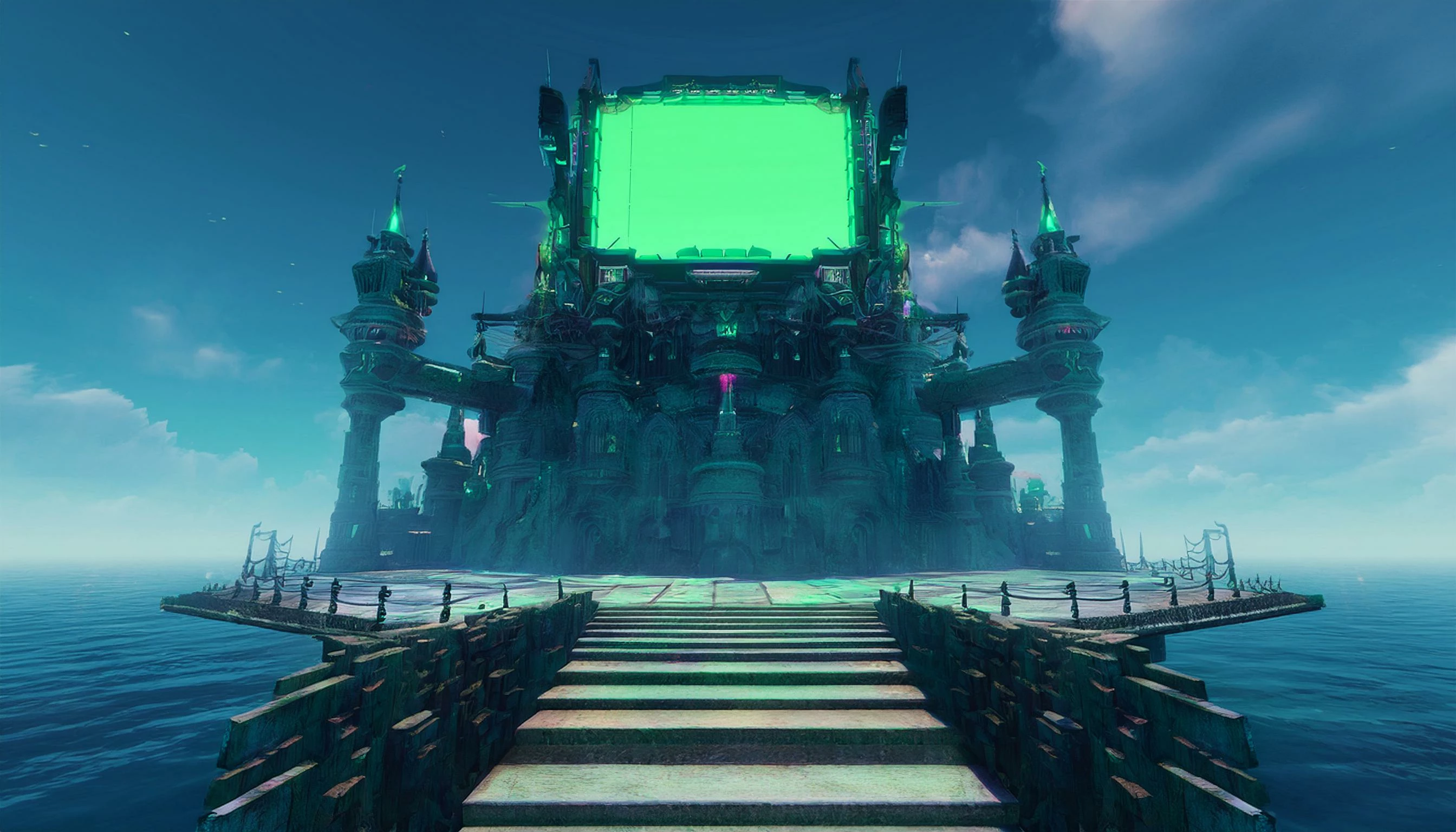 fantasy scifi neon cyberpunk castle on a flying island over the sea with a big stage in front news studio, big green display on stage front view