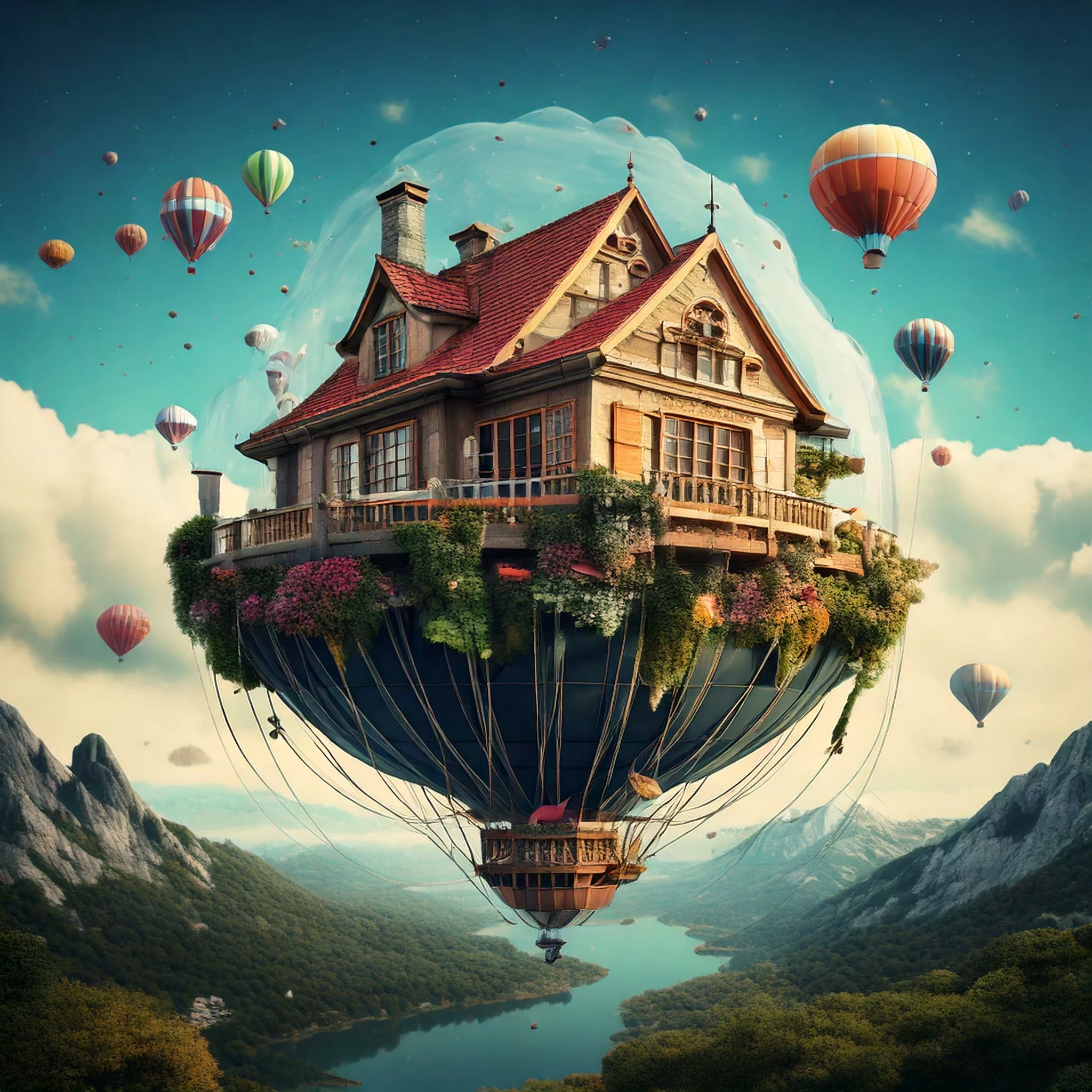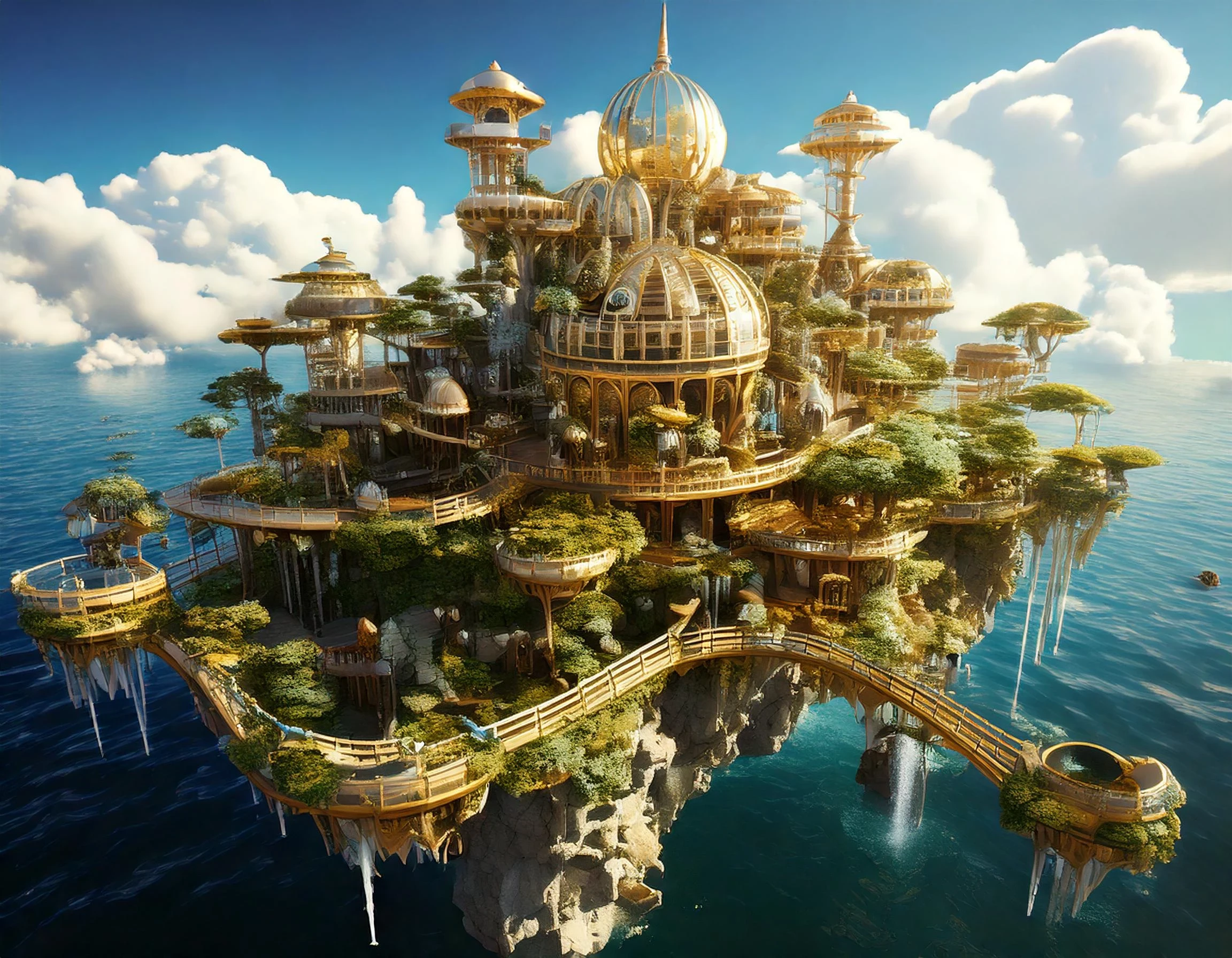 The Prompt I used: Levitating islands drift gracefully in the air, while cascading waterfalls tumble down, adding to the dreamlike atmosphere evokes a sense of magic and serenity in this otherworldly landscape.