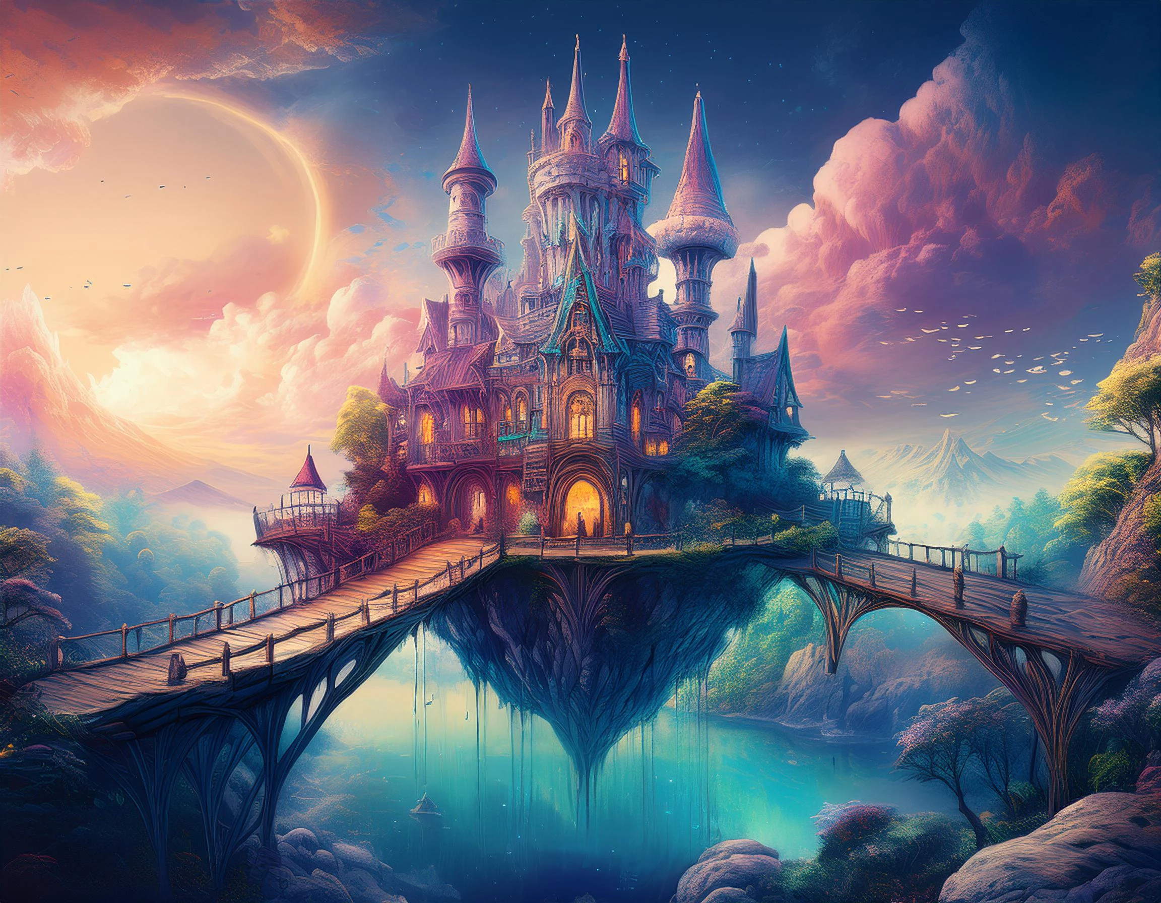 prompt: A surreal floating castle inspired by Alice in Wonderland, situated on a separate landmass suspended in the air. The floating landmass is distinct, yet interconnected with other hovering landmasses via magical, glowing bridges or vines. The castle features whimsical, otherworldly architecture, with curved towers, spires, and colorful patterns. The environment is a snowy wonderland, with soft snowflakes falling gently around. The atmosphere is illuminated by a stunning pink and purple sunset, casting a magical glow on the landscape. Ice formations and frost-covered trees adorn the surrounding landmasses, creating a harmonious and enchanting winter scene. The overall vibe is magical, serene, and captivating.