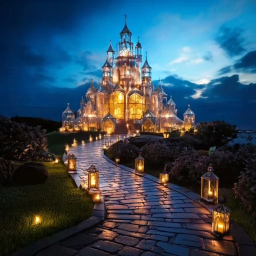 A glass castle in the sky. There is a long winding path lit by candle lanterns.