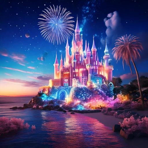 A glowing iridescent castle nestled on a beachfront where mythical creatures live in harmony, with cotton candy skies, fireworks, and flowers