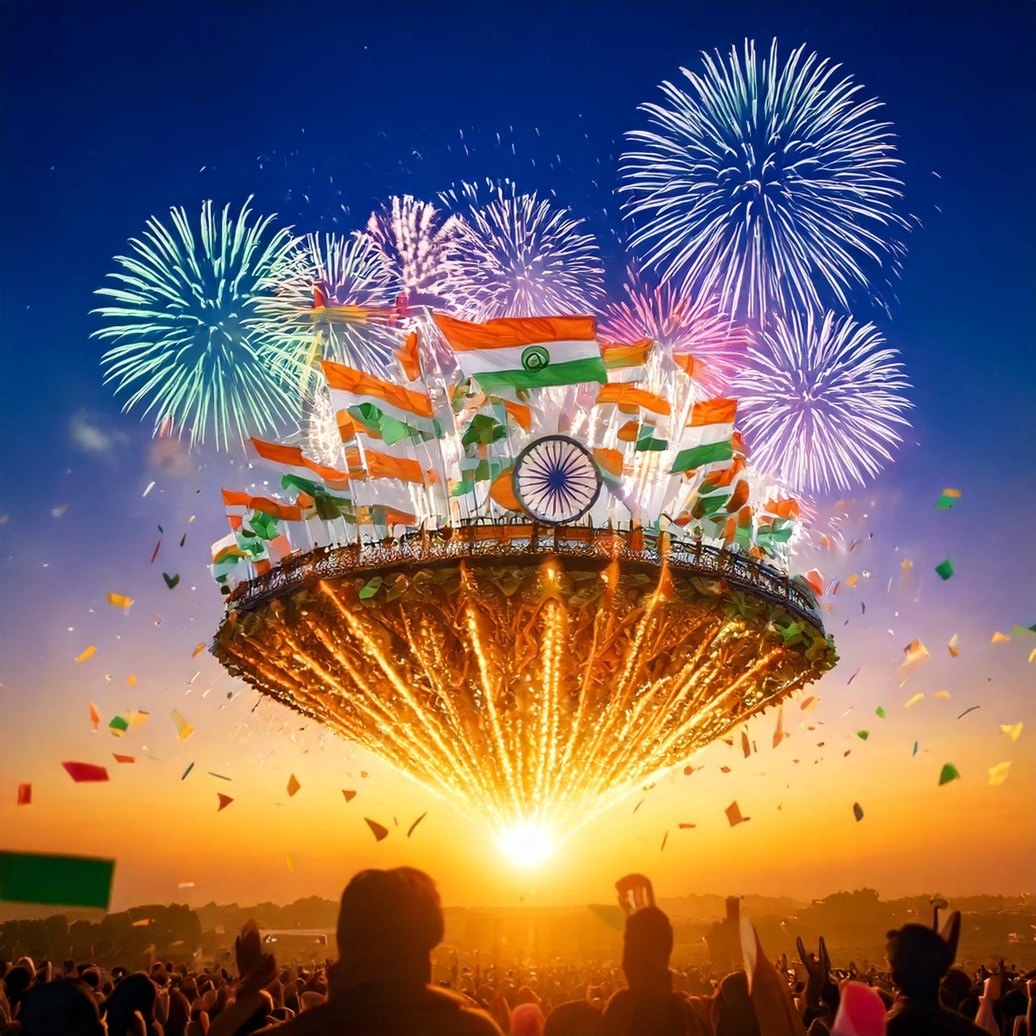 Prompt : A majestic floating island in the sky, adorned with Indian flags and vibrant decorations, celebrating Republic Day with traditional music, dance, and fireworks against a backdrop of a stunning sunset.