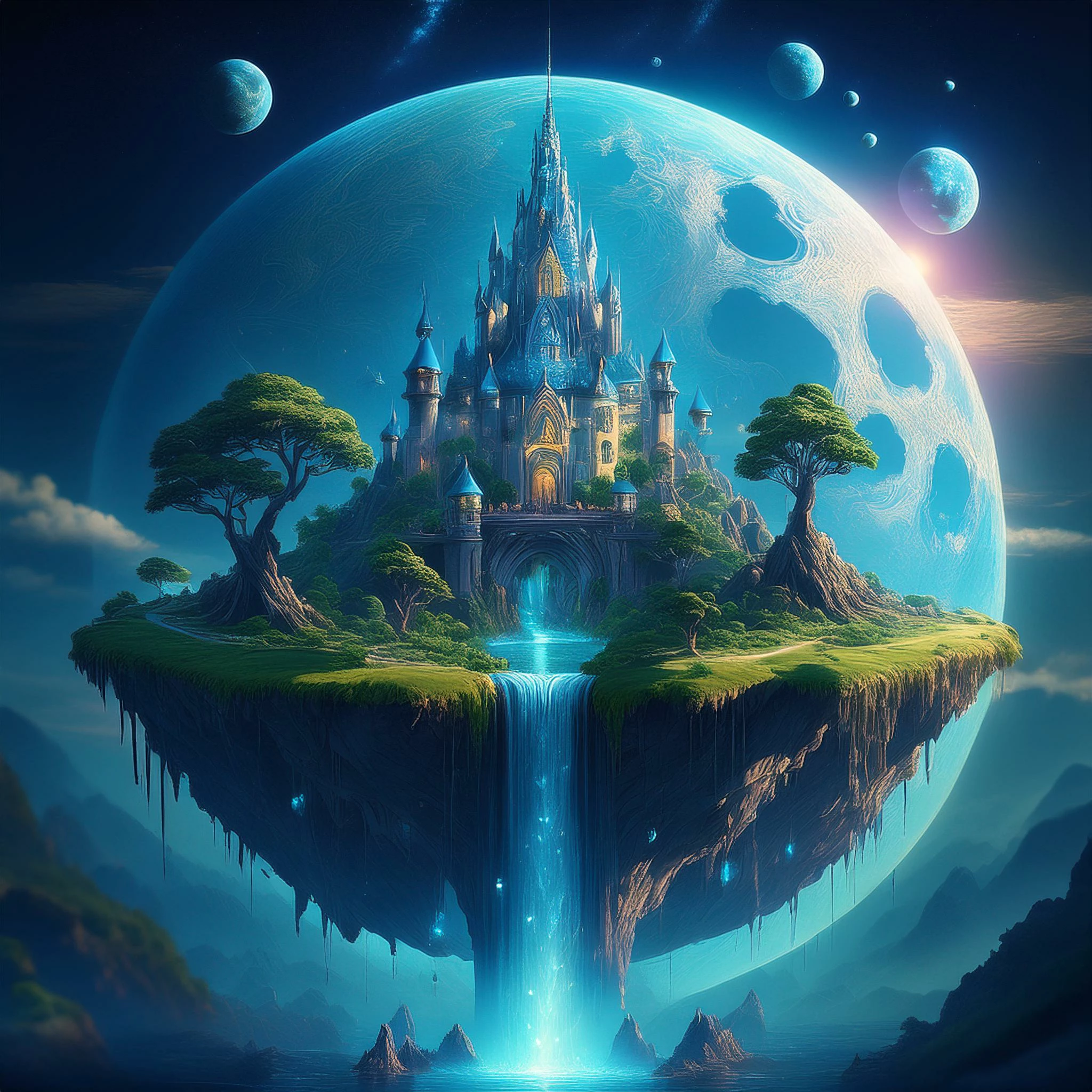 鏡頭中景拍攝,氛圍光罩.背景為1顆藍色星球,在童話般的世界,空中懸浮一座以月亮為造型的島嶼,上面有座覆蓋島嶼的皇宮, 島嶼上有山川,湖泊及河流,河流瀑布往地面流動