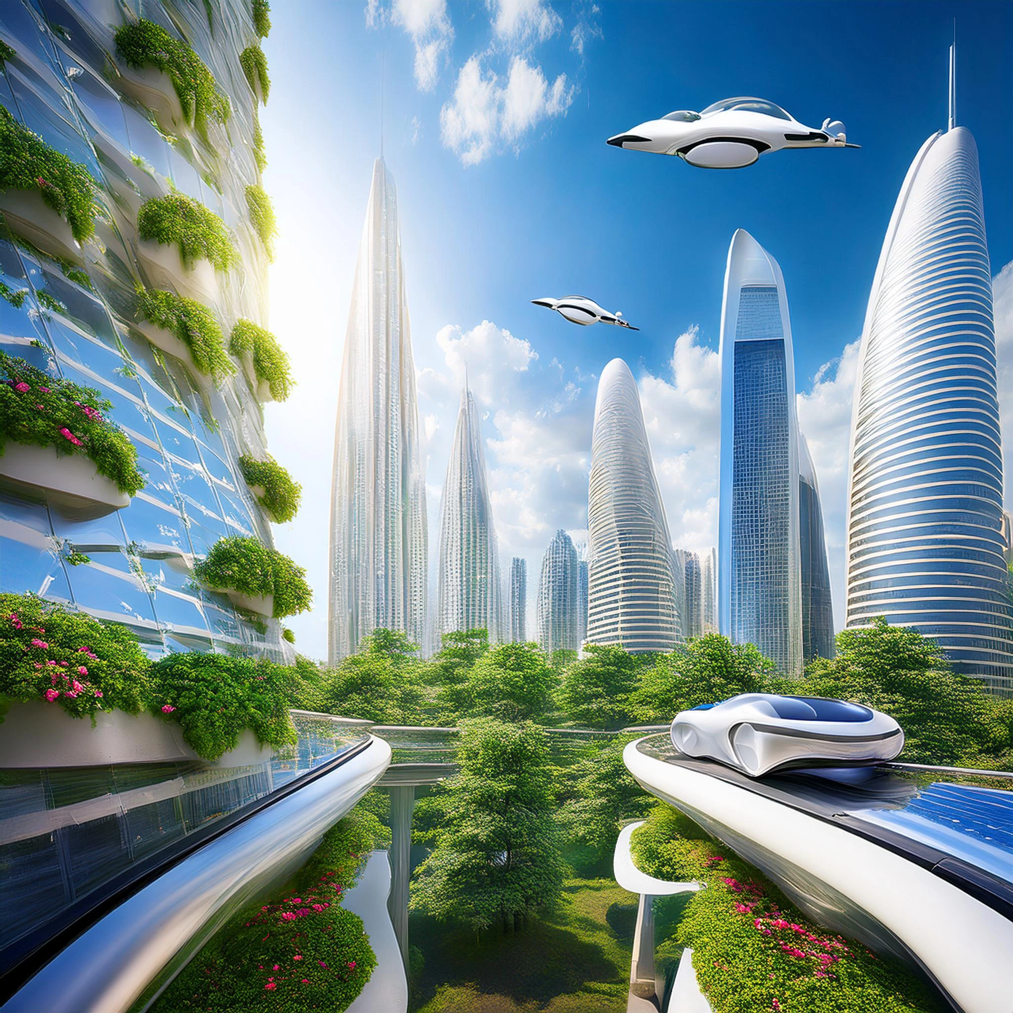 A futuristic world where technology, trees and flowers coexist harmoniously, white skyscrapers with plants on walls touch the blue sky, and futuristic white vehicles glide through the air ; sunny day ; concept: eco-friendly city