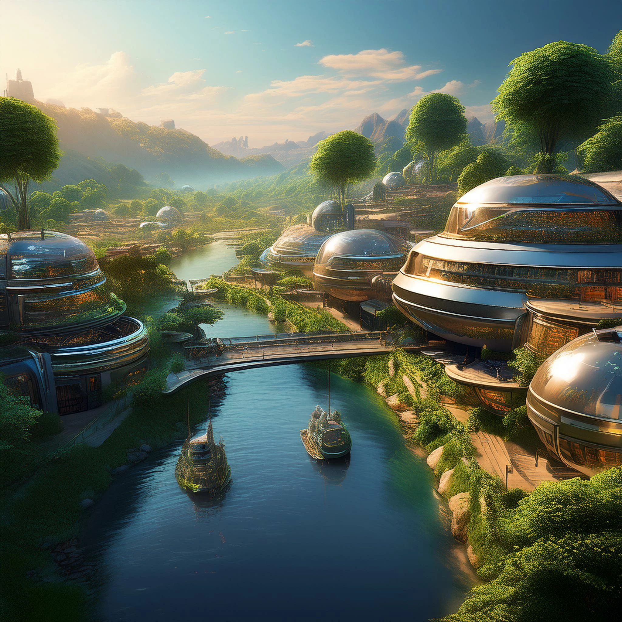Prompt: Create a small futuristic town in the country with trees and a river and walking paths