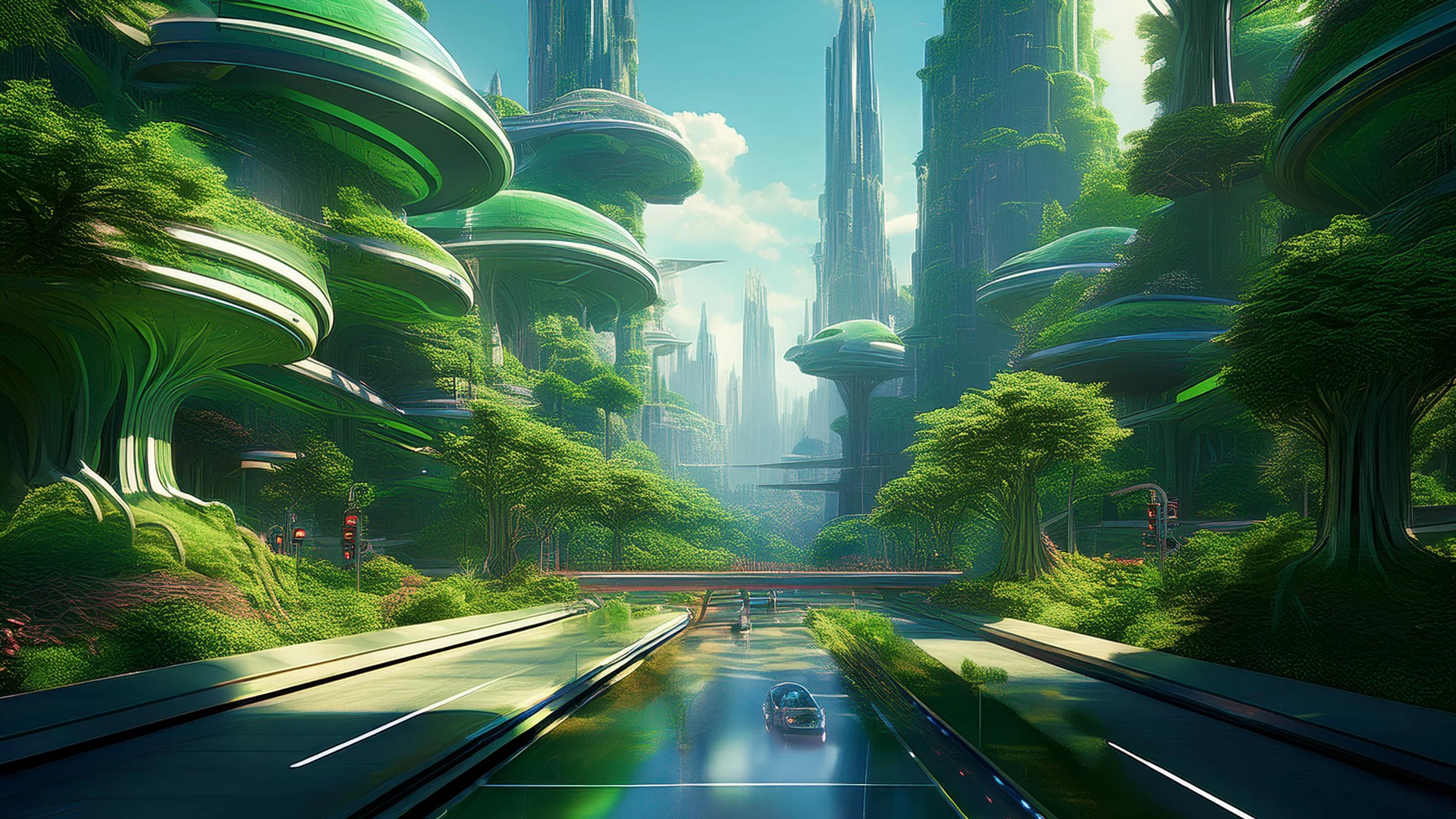 Prompt was "city of tomorrow street scene. lush green environment. cinematic. concept art."