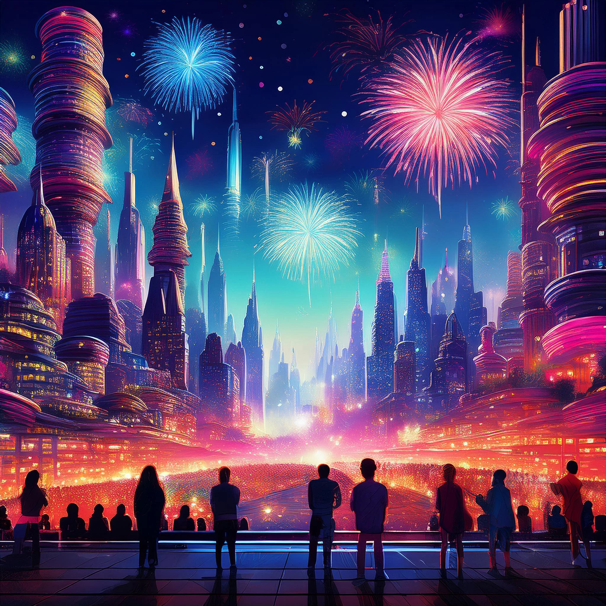 Create a sci-fi utopian like city. Focus the scene on an where people are watching a fireworks show. The skyline buildings are filled with colors, very tall and have unique formations.
