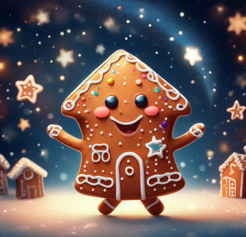 cartoon ginger bread house character, dancing under the stars