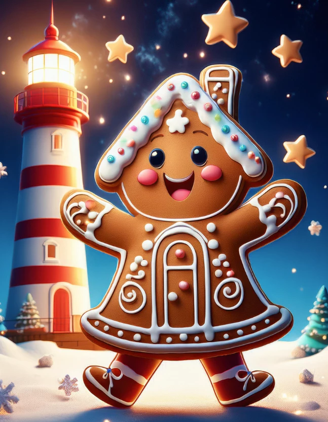 cartoon ginger bread house character, dancing under the stars, with a lighthouse in the background