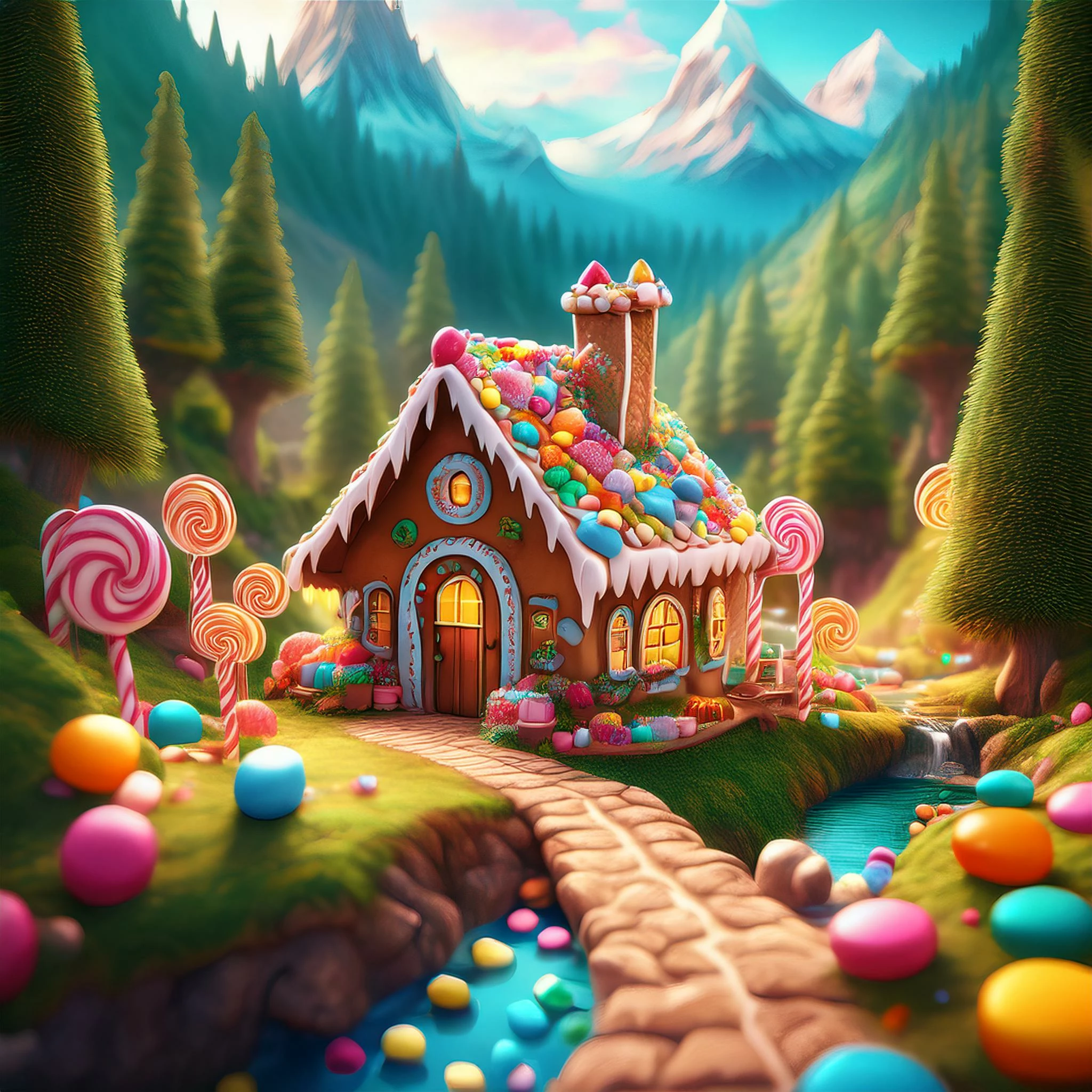 Prompt: Beautiful cozy fantasy gingerbread cottage with gumdrops in a candy forest aside a cookie path and a babbling brook. Mountains in the distance. Magical tone and feel, hyper realistic.
