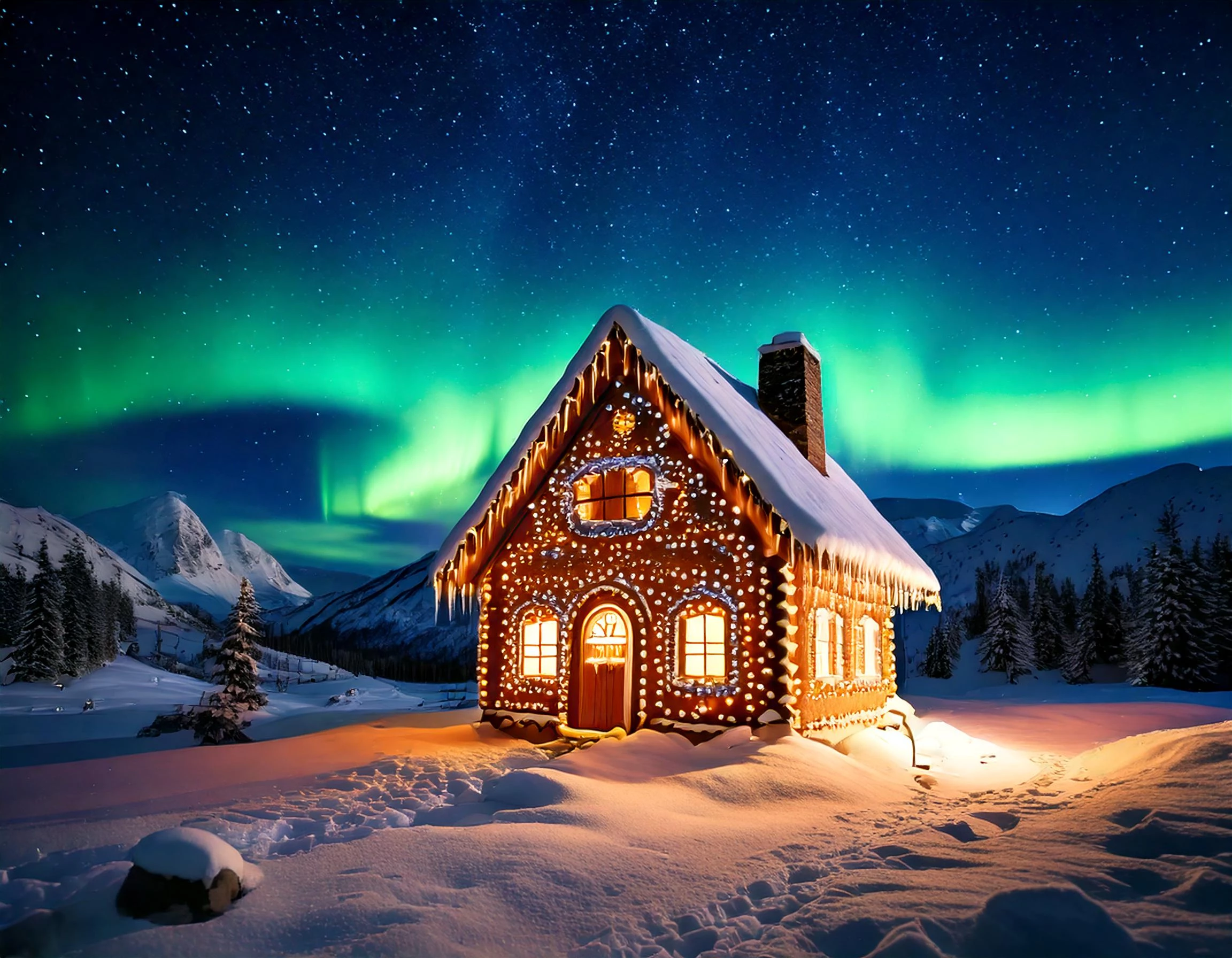 Prompt: A gingerbread house in a landscape with snow covered hills. a light shining inside, night scene with stars and aurora borealis