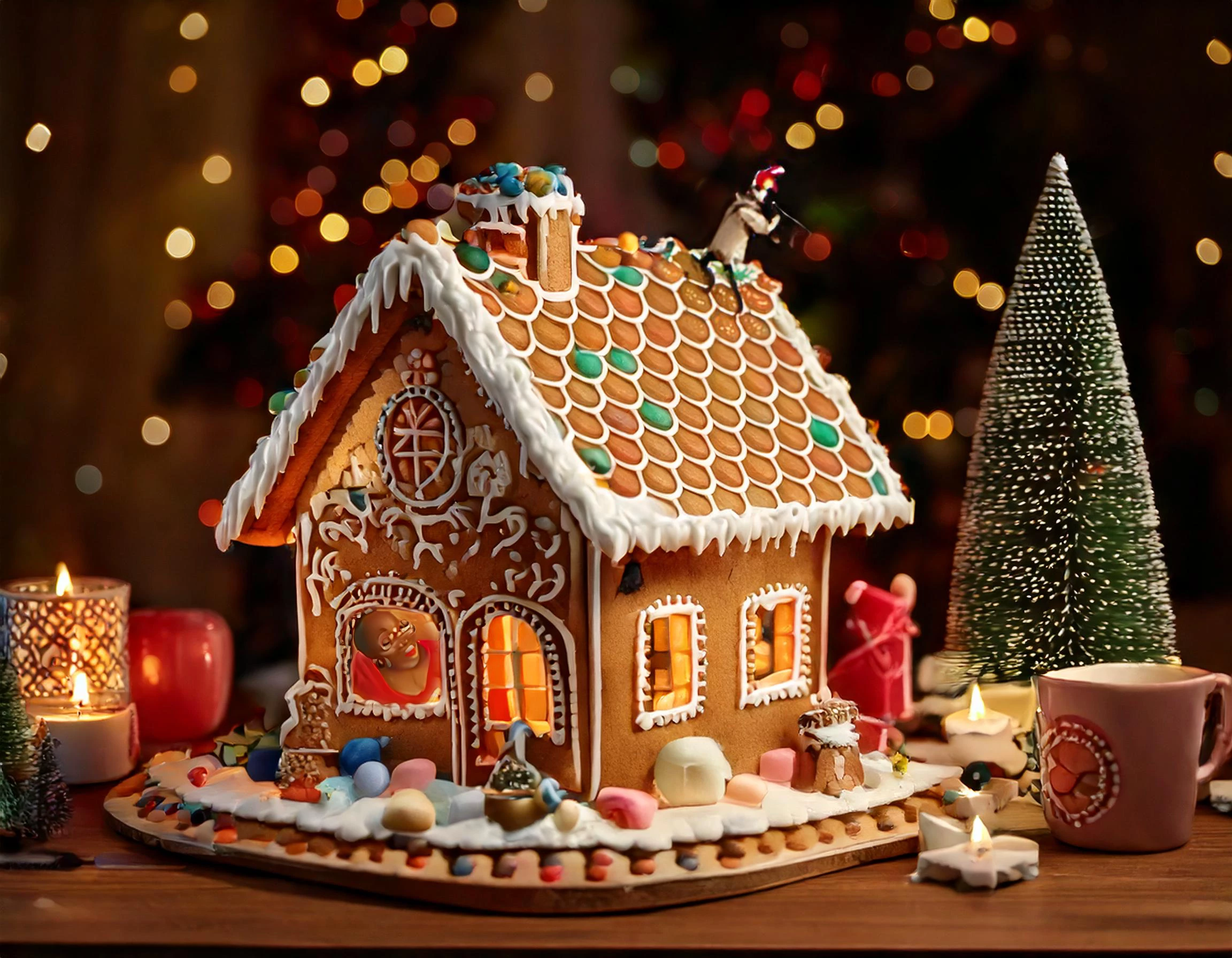 I used your prompt, "A gingerbread house adorned with colorful candies and icing, sitting on a festive table with hot cocoa mugs topped with whipped cream and marshmallows. Twinkling lights, Christmas cookies, and small tree." and then generative filled in a woman in window and skier on roof. Skier did not manifest, lol.