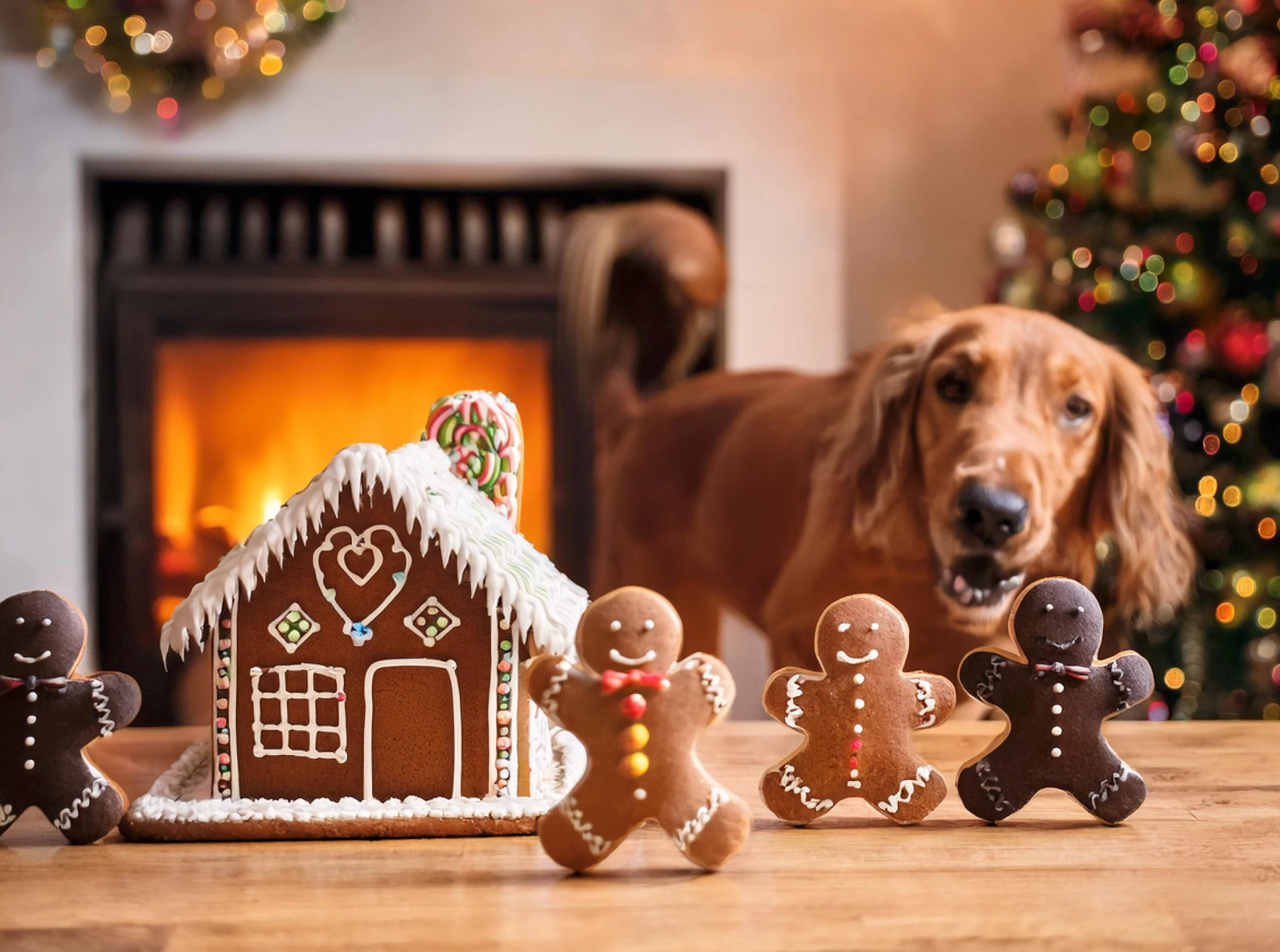 "Gingerbread house on a Christmas table; gingerbread people dancing around the table; fireplace in the background gives warmth to the room; dog licking it's lips staring at them"