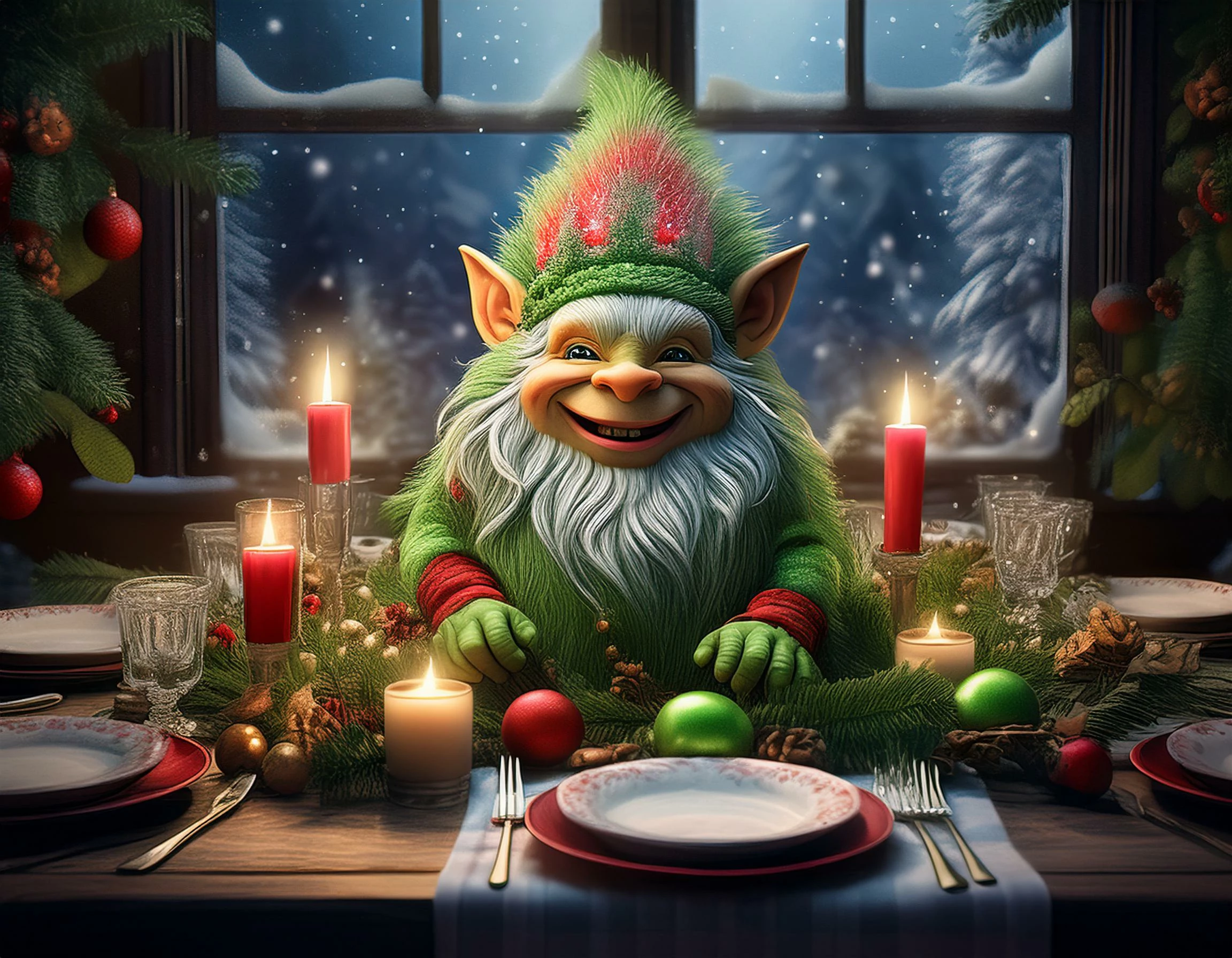 Prompt: colorful Norwegian troll centerpiece for a beautifully set Christmas dinner table [hyper realistic] [shot through a window]