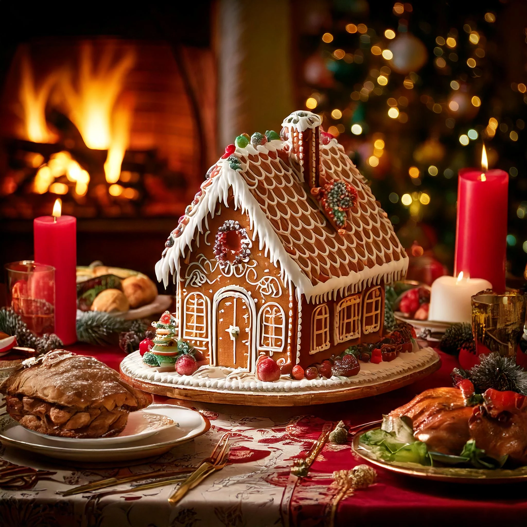 An elaborately decorated gingerbread house sits on a Christmas table, surround by the traditional far of the season. Christmas crackers are opened nearby with cooked turkey and ham further back on the table. Lights twinkle on the christmas tree in the background. Red candles side beside the house, and a roaring fire is visible off to the right.