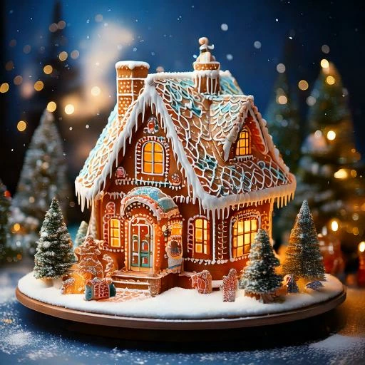 The Prompt I used: Imagine a gingerbread house adorned with colorful candies and icing, sitting on a festive table with hot cocoa mugs topped with whipped cream and marshmallows. Twinkling lights, Christmas cookies, and a small tree add a magical touch to the cozy scene.