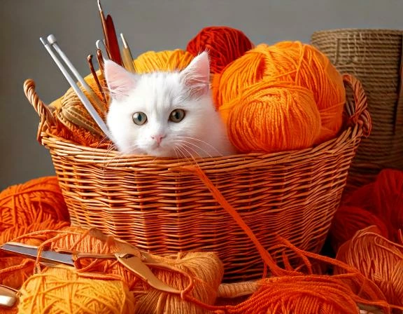 Prompt: very large willow basket full of orange yarn, knitting needles, scissors, and other craft items as well as a hidden white kitten