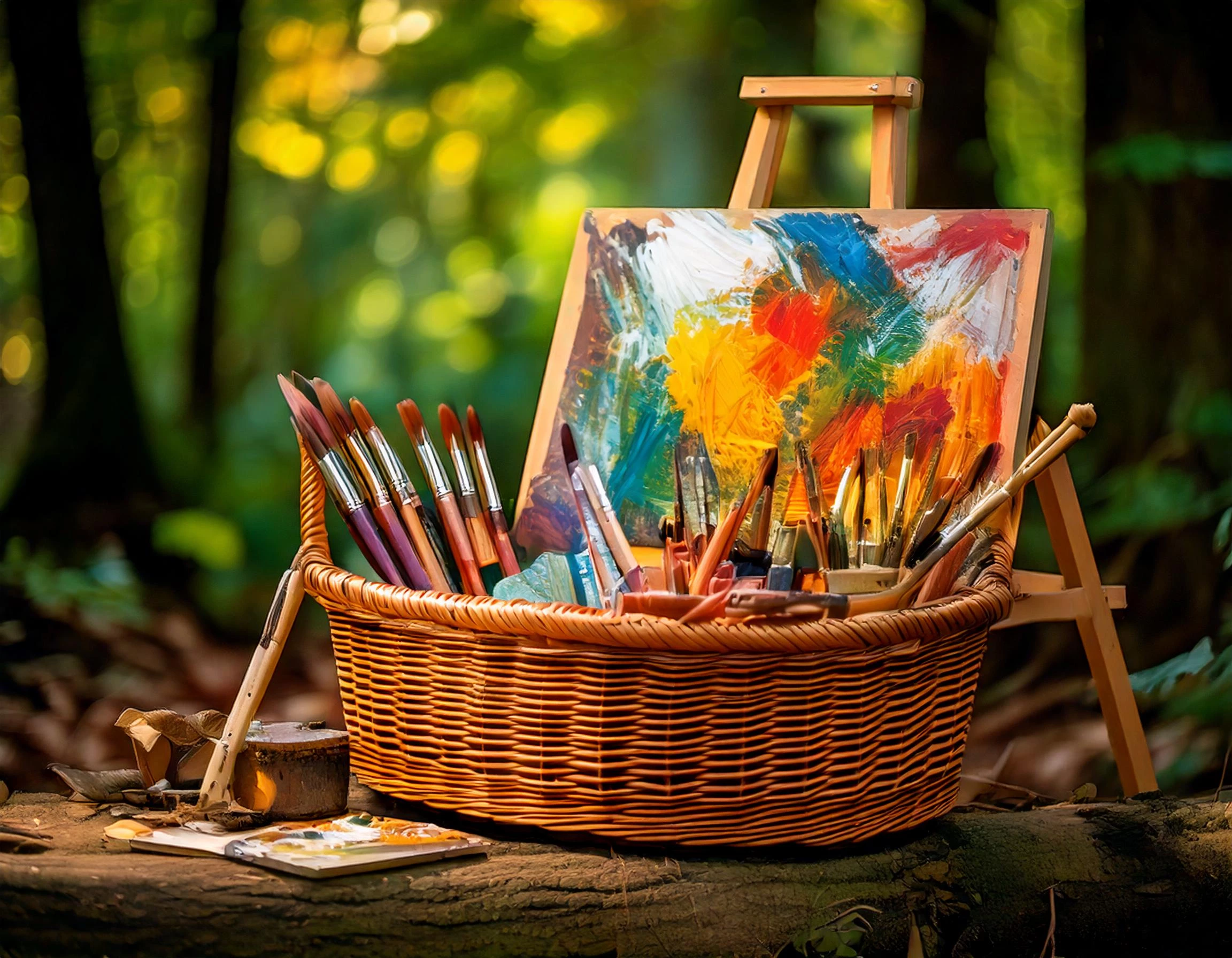 Prompt:  Woven bamboo basket, in a woodland setting, filled with creative tools, an easel with a canvas on it in the background with the start of a colourful oil painting