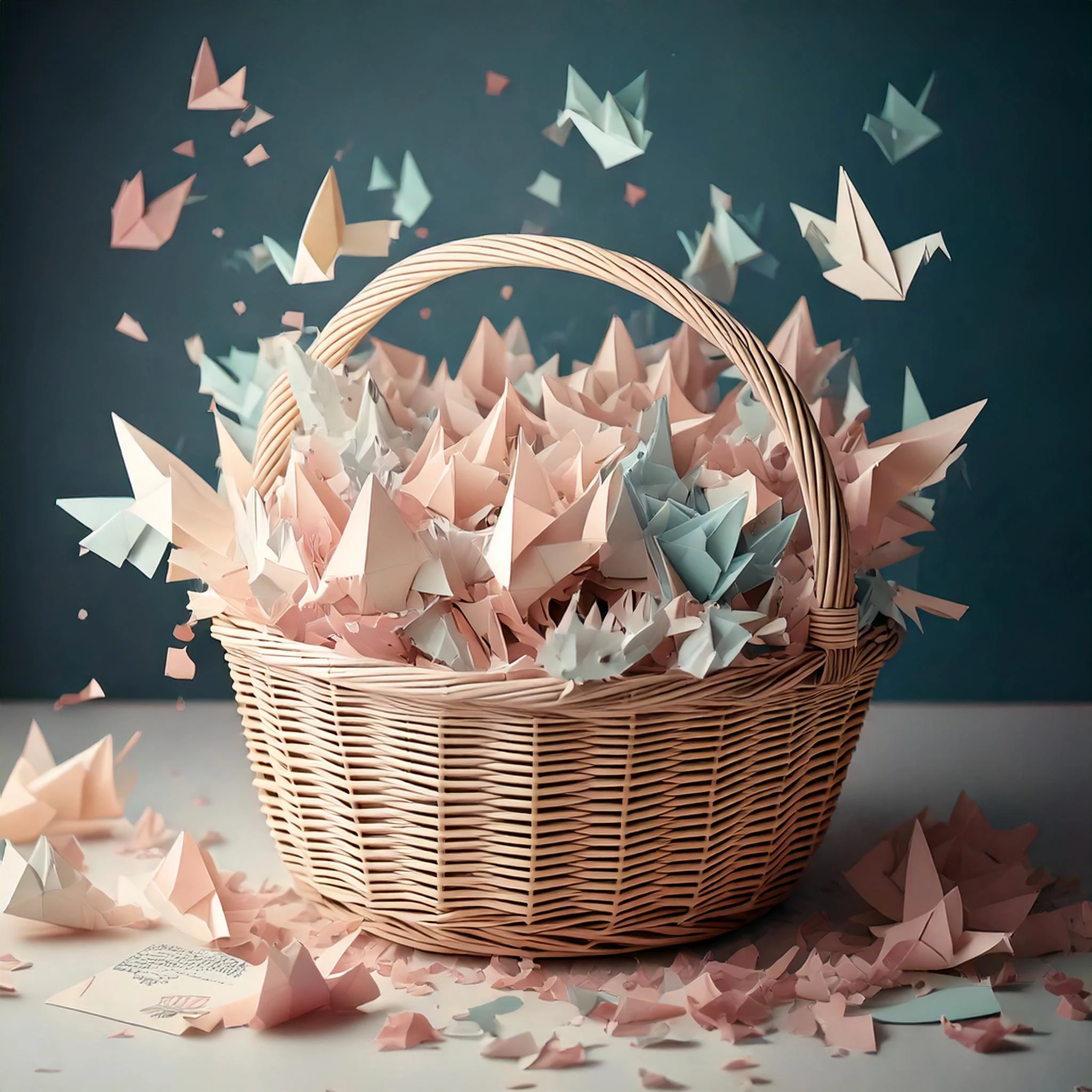 Prompt used: Generate an image of a delicate white basket woven from paper, containing origami creatures coming to life. Show paper birds mid-flight, paper dragons breathing paper flames, and paper butterflies beginning to float upward. Include soft pastel colors emerging as the creatures awaken. Place the basket on a surface scattered with origami stars and creative writing pages.
