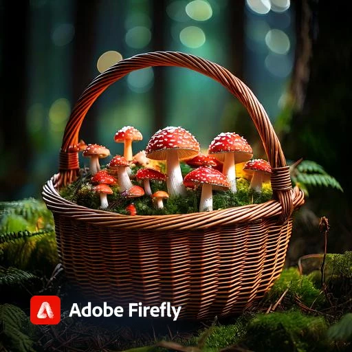 Create an image of a woven wicker basket in a magical woodland full of magical and mystical brightly coloured small mushrooms growing