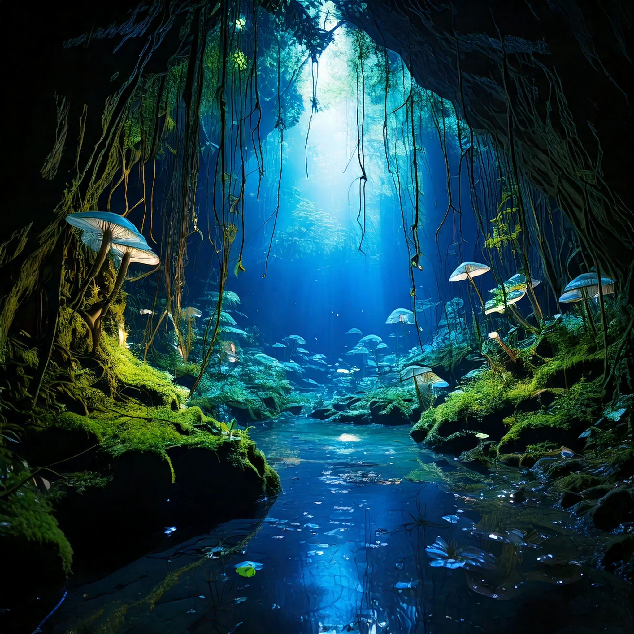 deep cave lies a luminescent underground forest; peace of sound; mushrooms glow like lanterns; divine shine; vines shimmer with an ethereal blue hue; strange, part butterfly float through the air; In the center of this magical realm; an ancient crystal pool reflects the stars; despite being miles beneath the earth; as if holding a portal to another world; covered in moss and glowing runes;